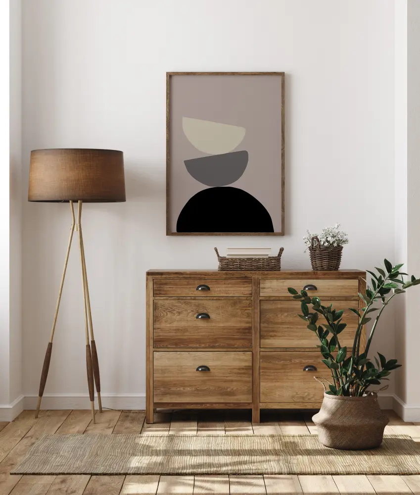Um póster abstrato com três semicírculos empilhados uns sobre os outros num fundo cinzento. Um grande semicírculo preto está na parte inferior, um semicírculo cinzento médio equilibra no topo enquanto equilibra um semicírculo branco mais acima. Crie uma atmosfera fresca numa parede azul ou uma atmosfera mais quente numa parede bege ou creme.