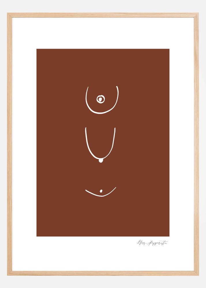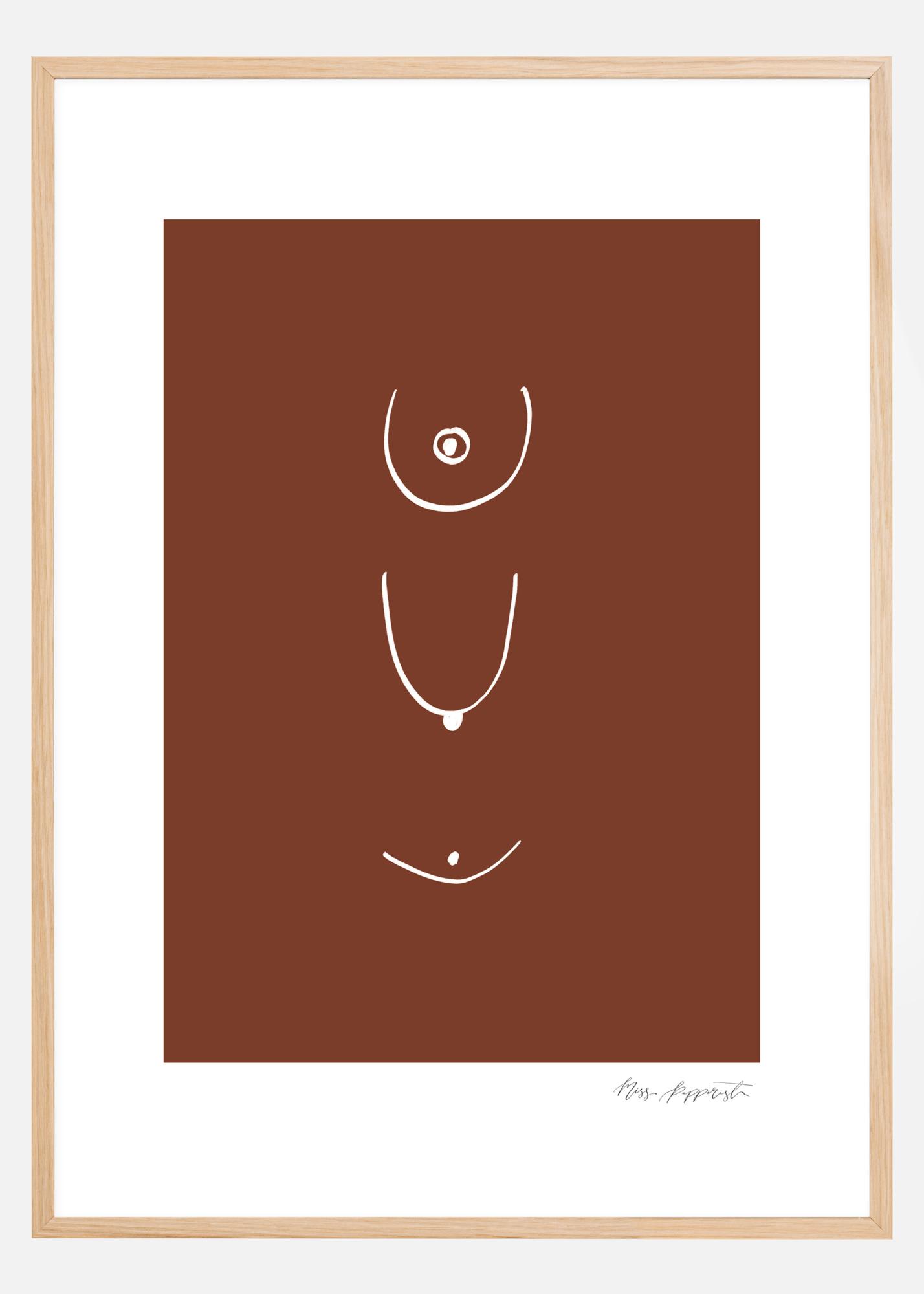 Um póster abstrato com linhas curvas e pontos brancos num fundo marrom simples. As linhas podem ser interpretadas de várias maneiras, mas parecem se assemelhar a seios femininos desenhados de diferentes ângulos. Aprecie a natureza um tanto peculiar dessa imagem simples.
