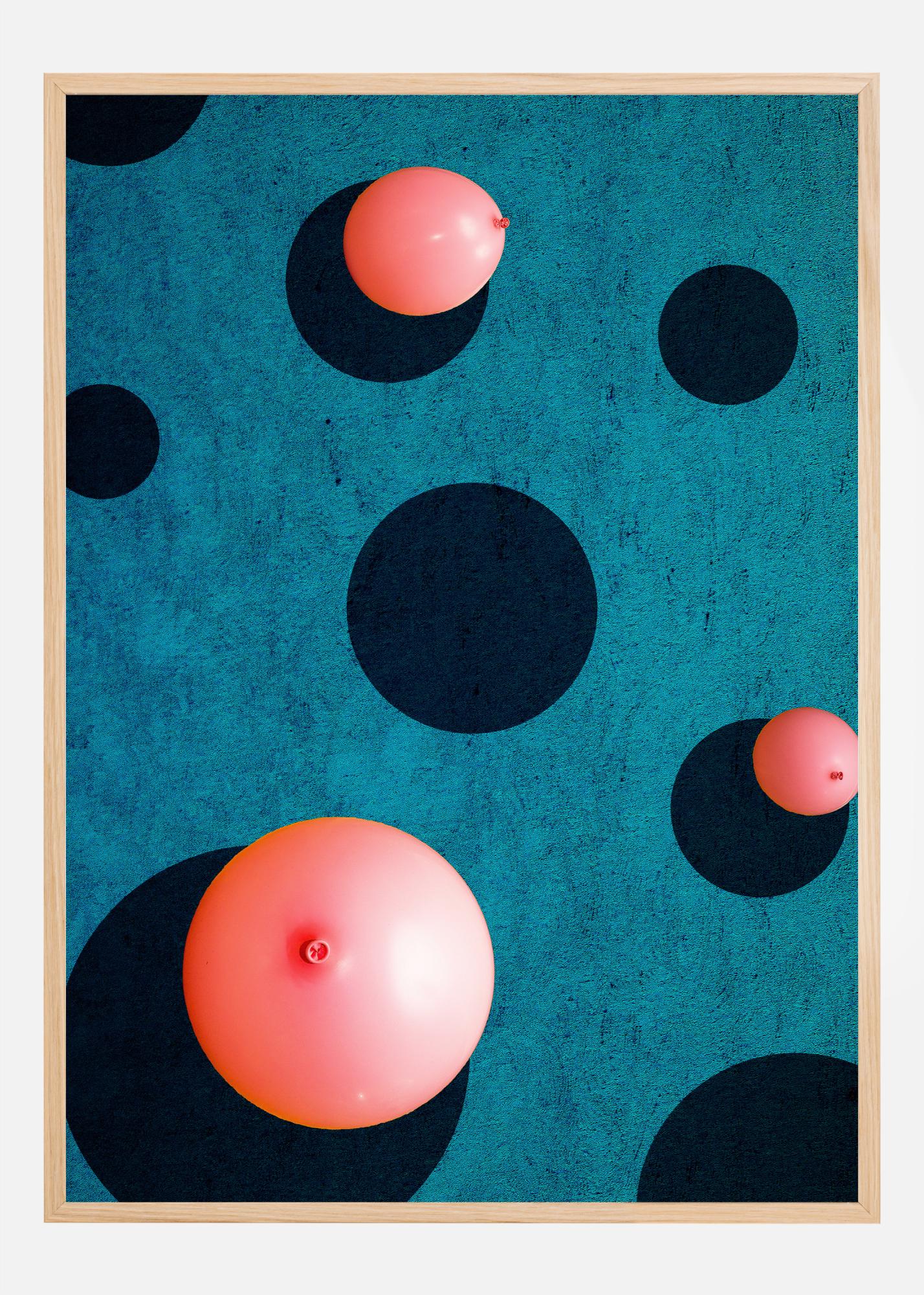 Um póster alegre com três balões laranjas num fundo azul. Cada balão lança uma sombra escura no fundo. Mas também há mais círculos de sombra azul escuro. Os outros balões devem estar flutuando em algum lugar mais alto neste póster estranho, mas fascinante, com pontos.