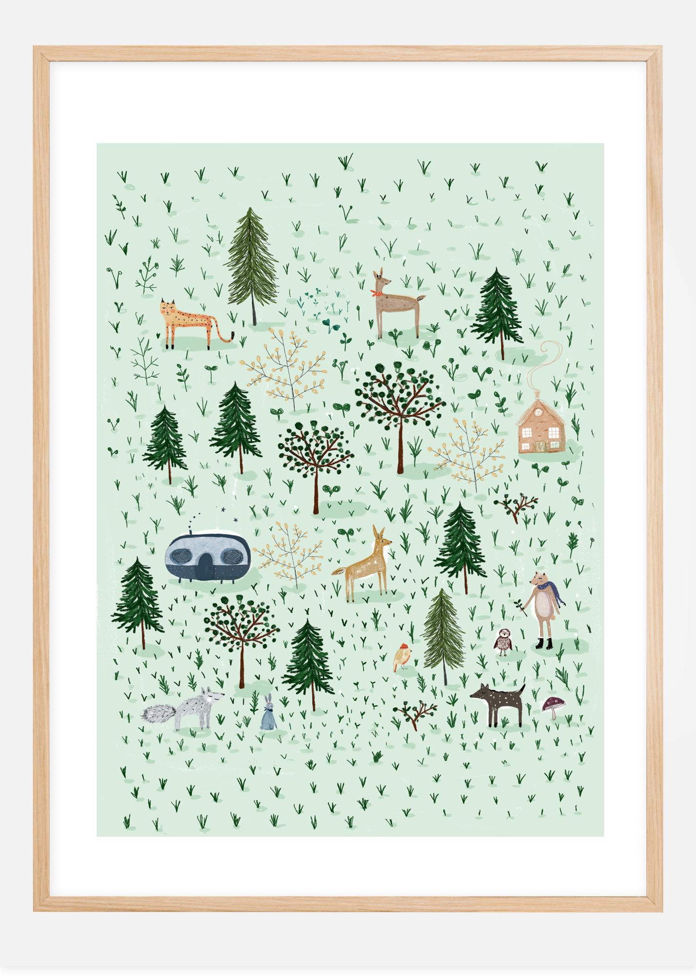 Um póster divertido com uma pequena floresta, principalmente cheia de diferentes animais. Esta é uma ilustração gráfica com árvores, animais e casas simplificados espalhados. Nada está em escala. Há uma raposa grande em pé com cachecol e botas, uma casa pequena e uma caravana maciça. É brega, adorável e lembra um cartão de Natal. Um póster excelente para todas as divisões da casa.