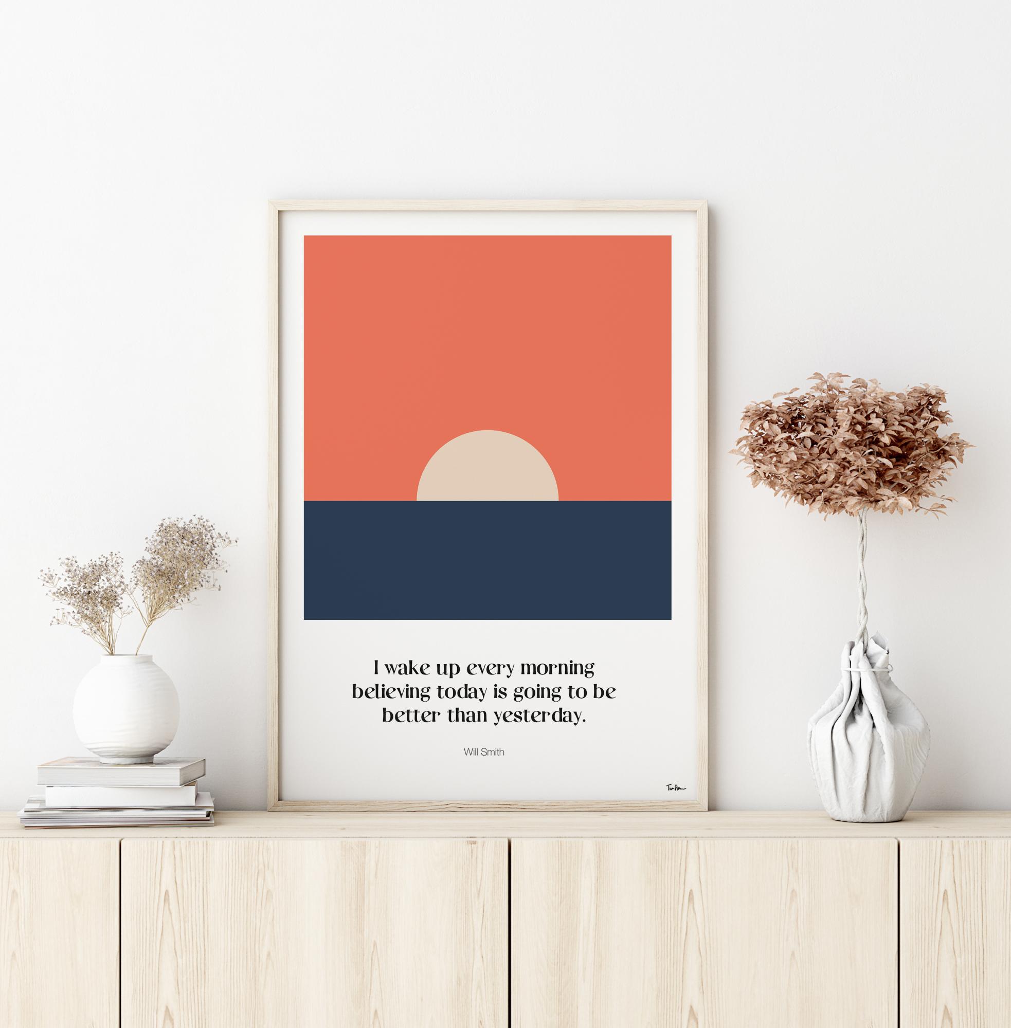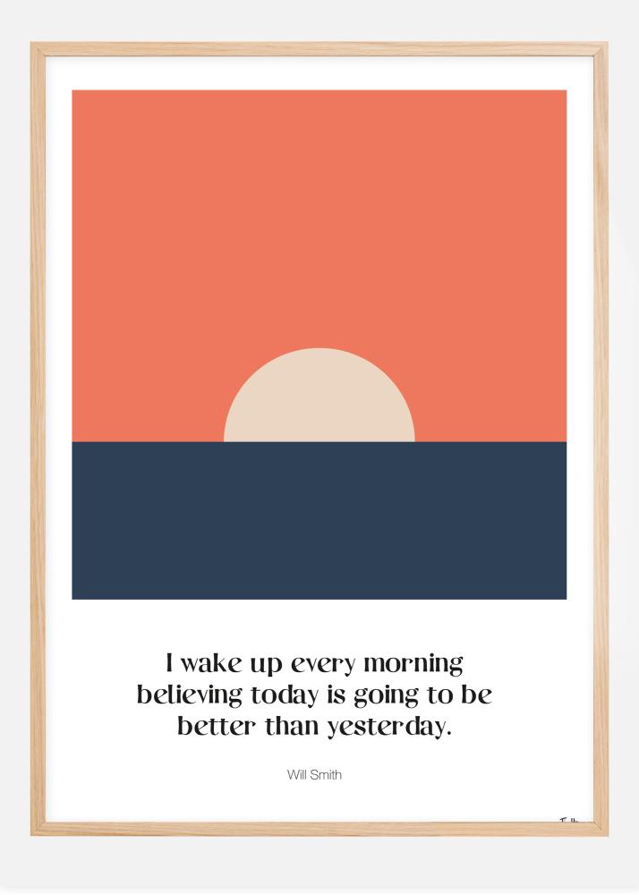 Um póster de texto com a citação de Will Smith "Eu acordo todas as manhãs acreditando que hoje será melhor do que ontem" escrito sob uma ilustração gráfica de um nascer do sol. Um póster elegante e elegante criado por Tim Hansson.