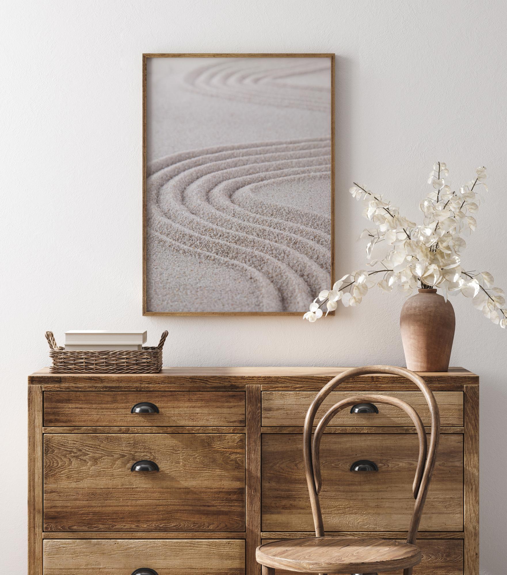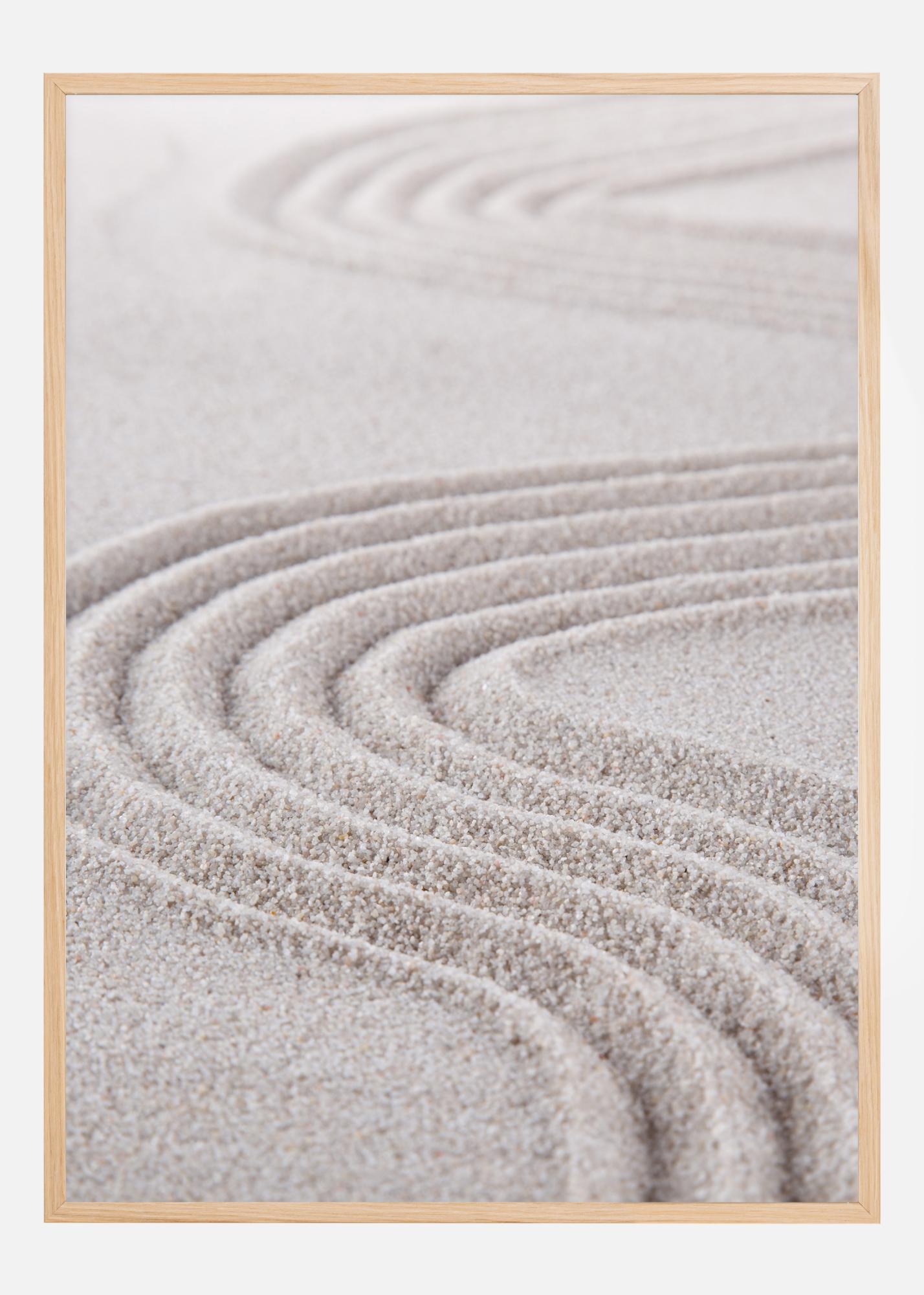 Um póster de close-up com linhas rastreadas na areia. Um ancinho foi usado para criar redemoinhos na areia, as linhas com a mesma distância entre si para criar sulcos profundos. Graças ao close-up, é possível ver os grãos no divertido padrão de redemoinho. Combine com uma parede bege para trazer a cor arenosa para a imagem.