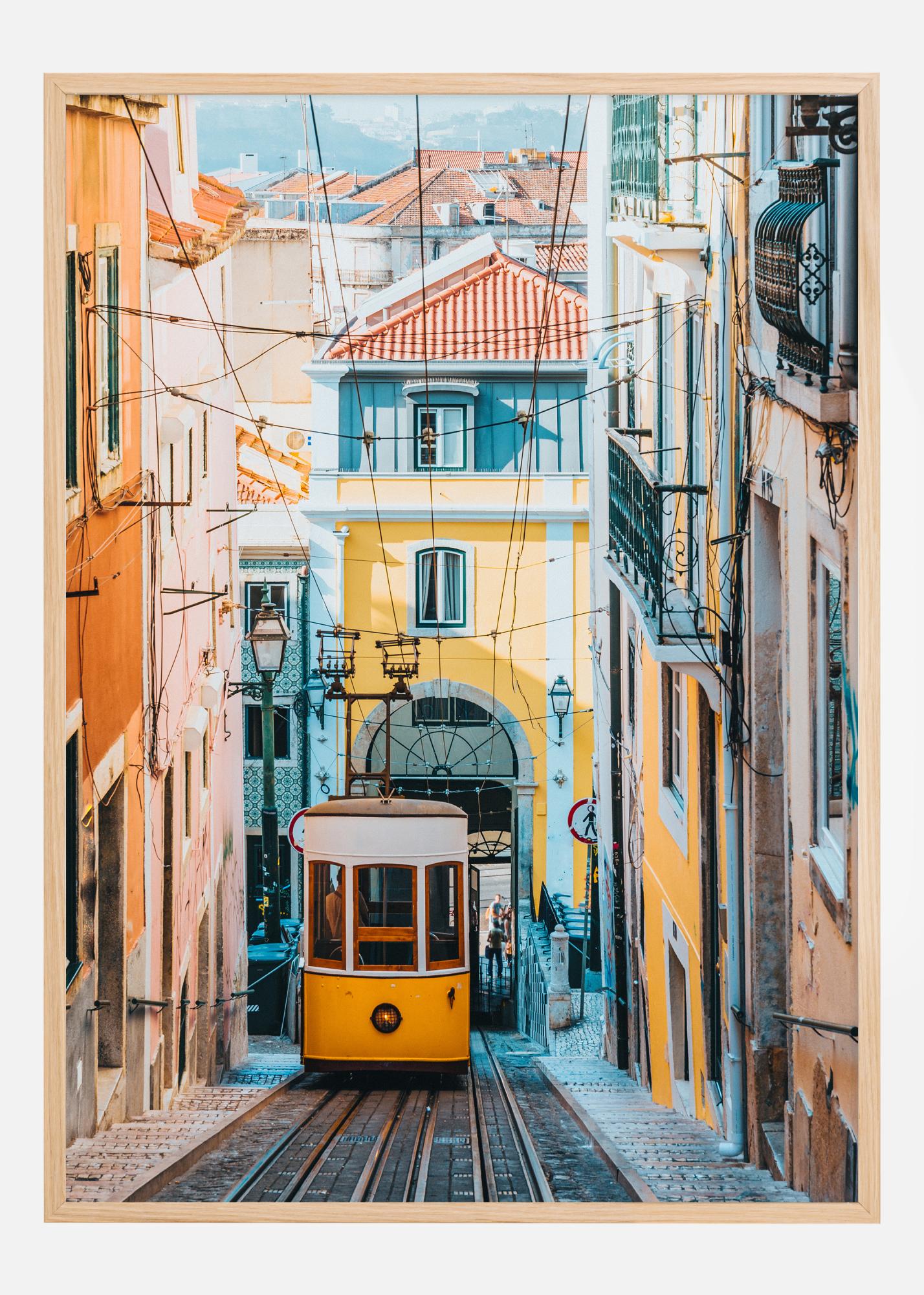 Este cartaz colorido e pitoresco retrata a atmosfera charmosa e vibrante de uma rua de cidade europeia, cheia de história e magia do cotidiano. Em primeiro plano, vemos um clássico bonde amarelo, um símbolo icônico do transporte público da cidade, que se move calmamente ao longo das ruas estreitas flanqueadas por arquitetura tradicional em tons quentes de amarelo e vermelho. Este pôster é como uma abertura para outro mundo, convidando-nos a embarcar e descobrir os segredos da cidade.