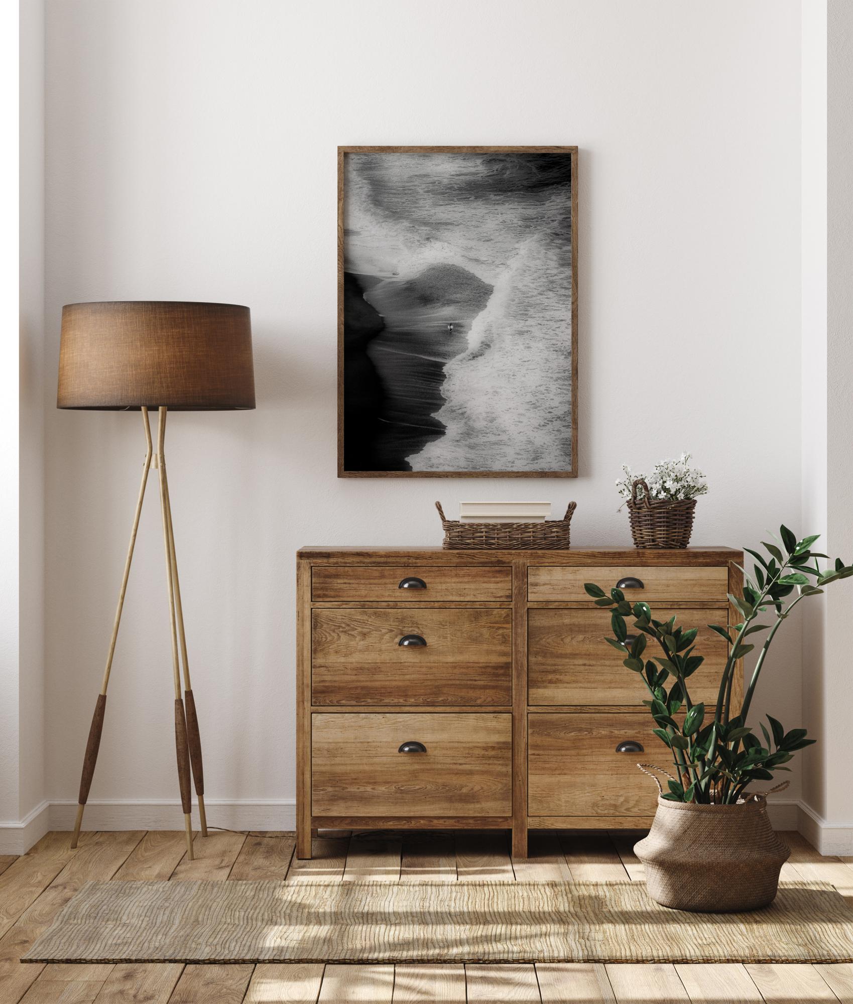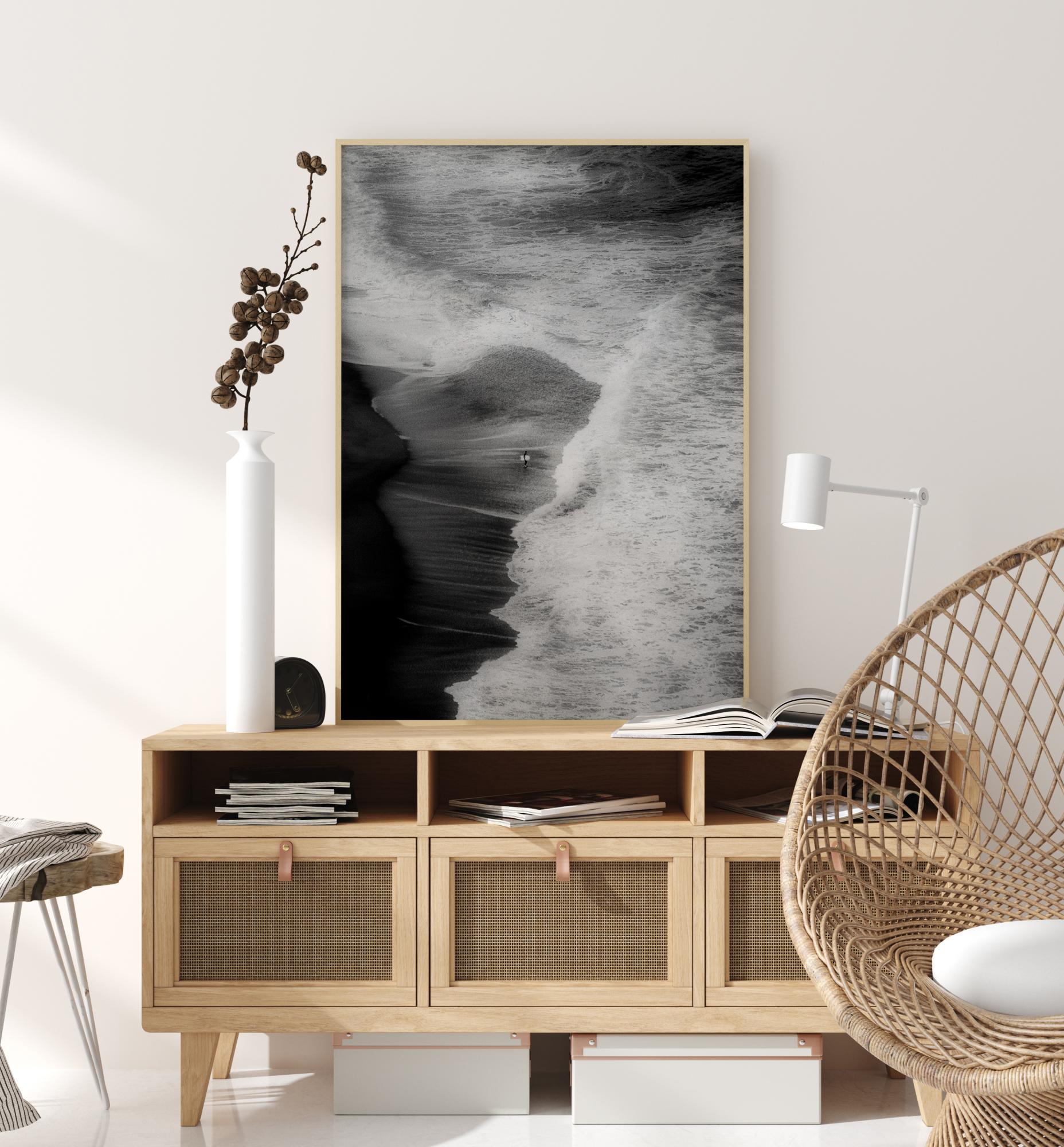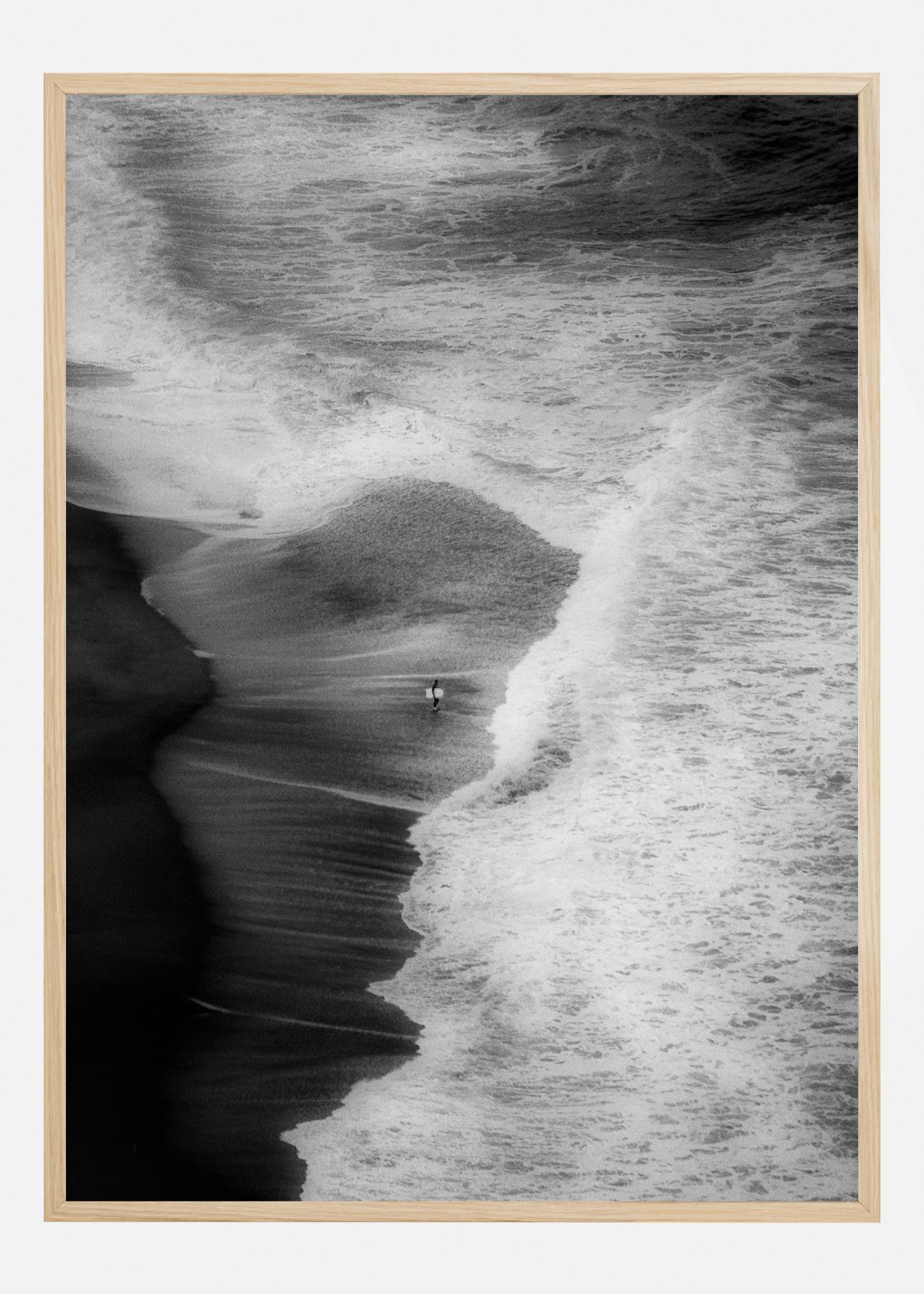 Um póster com uma praia e surfando do ar. Esta imagem abstrata mostra a grandiosidade da natureza quando as ondas alcançam a praia - o surfista solitário é o ponto focal da imagem.
