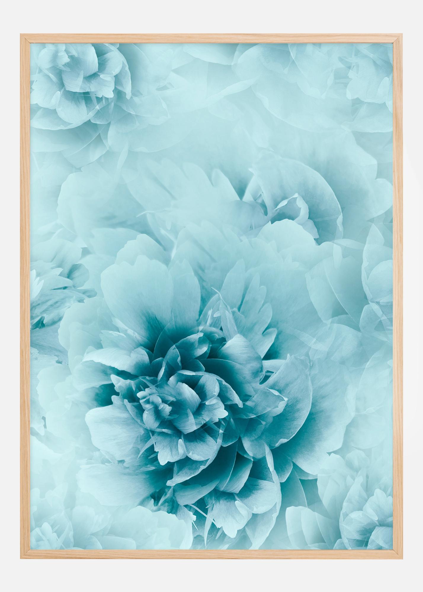 Este cartaz cativante captura a beleza de um mar de flores em um tom turquesa onírico. As pétalas sobrepostas formam um mosaico texturizado que é visualmente atraente e profundamente relaxante. Os tons frios e frescos desta imagem evocam um mundo subaquático claro e calmante ou um jardim em flor à luz da lua.
