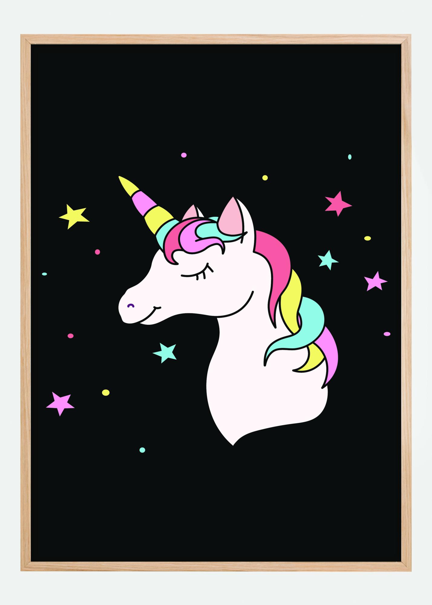 Um póster adorável com um unicórnio branco infantil num fundo preto. O unicórnio tem uma crina e um chifre rosa, amarelo e turquesa. Estrelas nas mesmas cores preenchem o fundo preto para criar um clima divertido digno de uma princesa. Pendure isso no quarto das crianças para ter uma imagem divertida e única que estimula a imaginação das crianças.