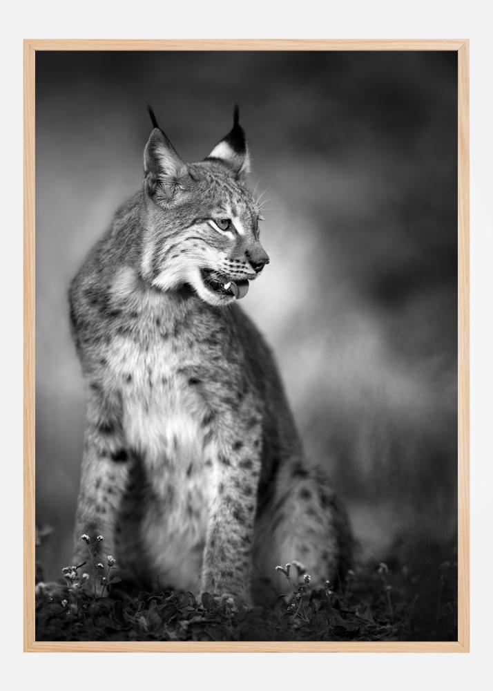 Um póster de vida selvagem com um lince sentado na grama. O gato está olhando para a direita na imagem e talvez esteja observando uma presa em potencial. As manchas claras na pelagem e as tufos nas orelhas se destacam em detalhes claros. Pendure esta impressão preto e branco numa parede verde para uma sensação natural.