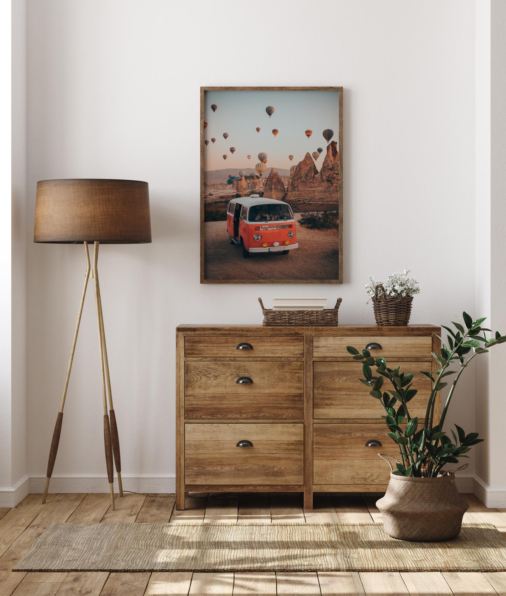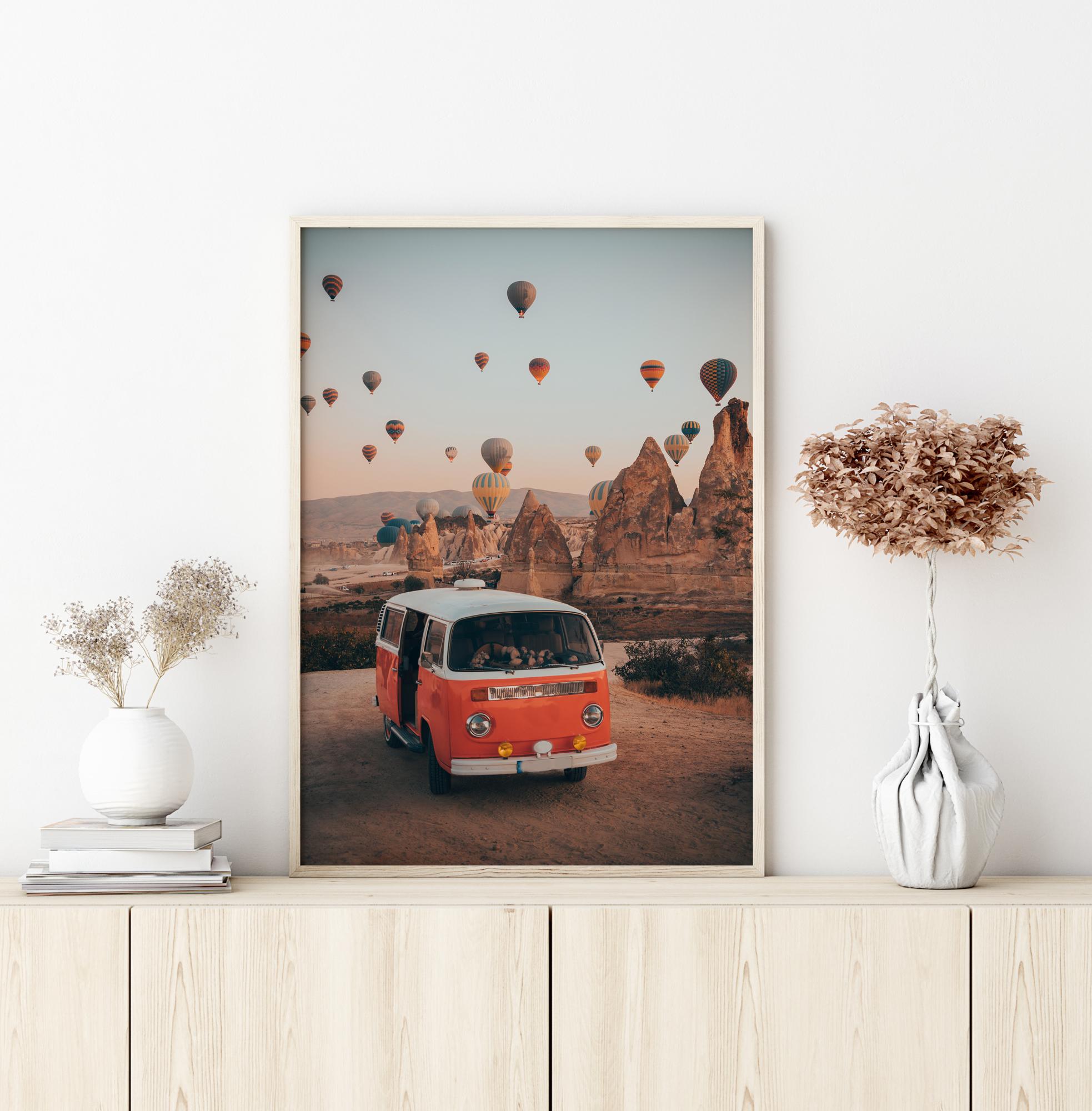 Um cartaz de paisagem com formações rochosas interessantes e balões de ar quente voando sobre o topo. Uma van Volkswagen laranja com a porta aberta está em primeiro plano. Os balões coloridos enchem o céu atrás enquanto eles sobem em direção ao céu azul claro para uma viagem mágica.