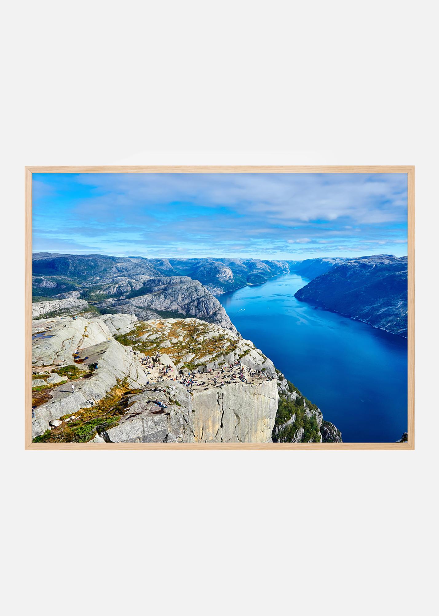 Fotografia com uma vista deslumbrante de uma profunda vila de fjord. O póster é em tons de azul marinho com penhascos nus iluminados pelo sol em ambos os lados do fjord, uma paisagem magnífica que combina na parede de quem aprecia uma bela cena natural. Complemente a imagem com uma moldura que destaque o motivo.