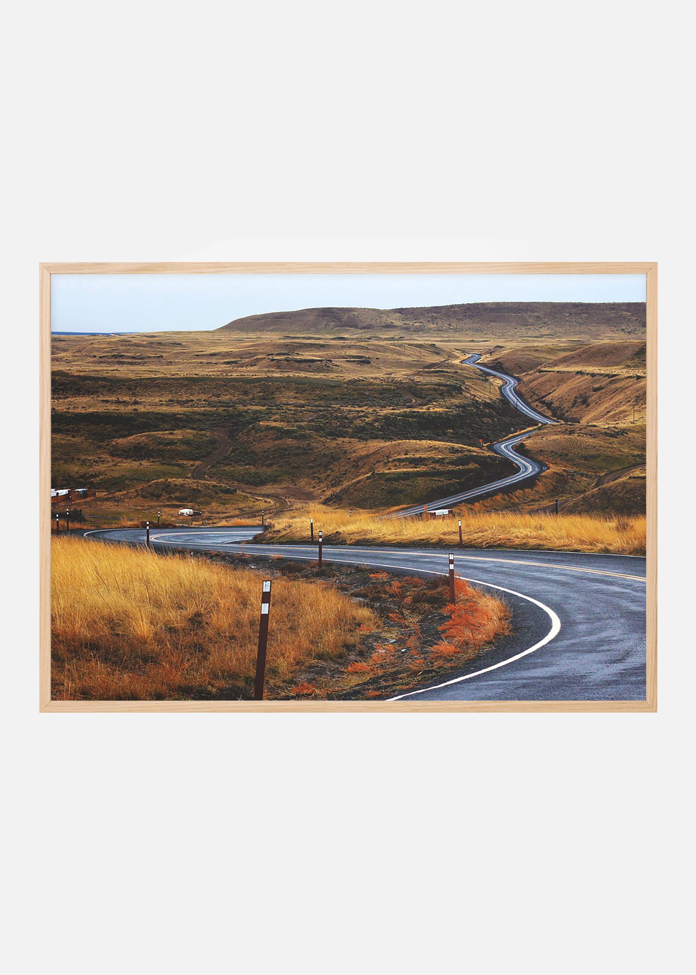 Póster com uma estrada asfaltada que serpenteia por uma paisagem de estepes queimadas pelo sol. As tonalidades de grama amarelo-marrom contrastando com a superfície fria do asfalto, que se destaca na paisagem aberta, fazem com que o olhar seja atraído para a imagem e siga a estrada. O cartaz fica bem numa moldura minimalista, onde o motivo pode se destacar e pode ser combinado com outras pinturas em um tema.