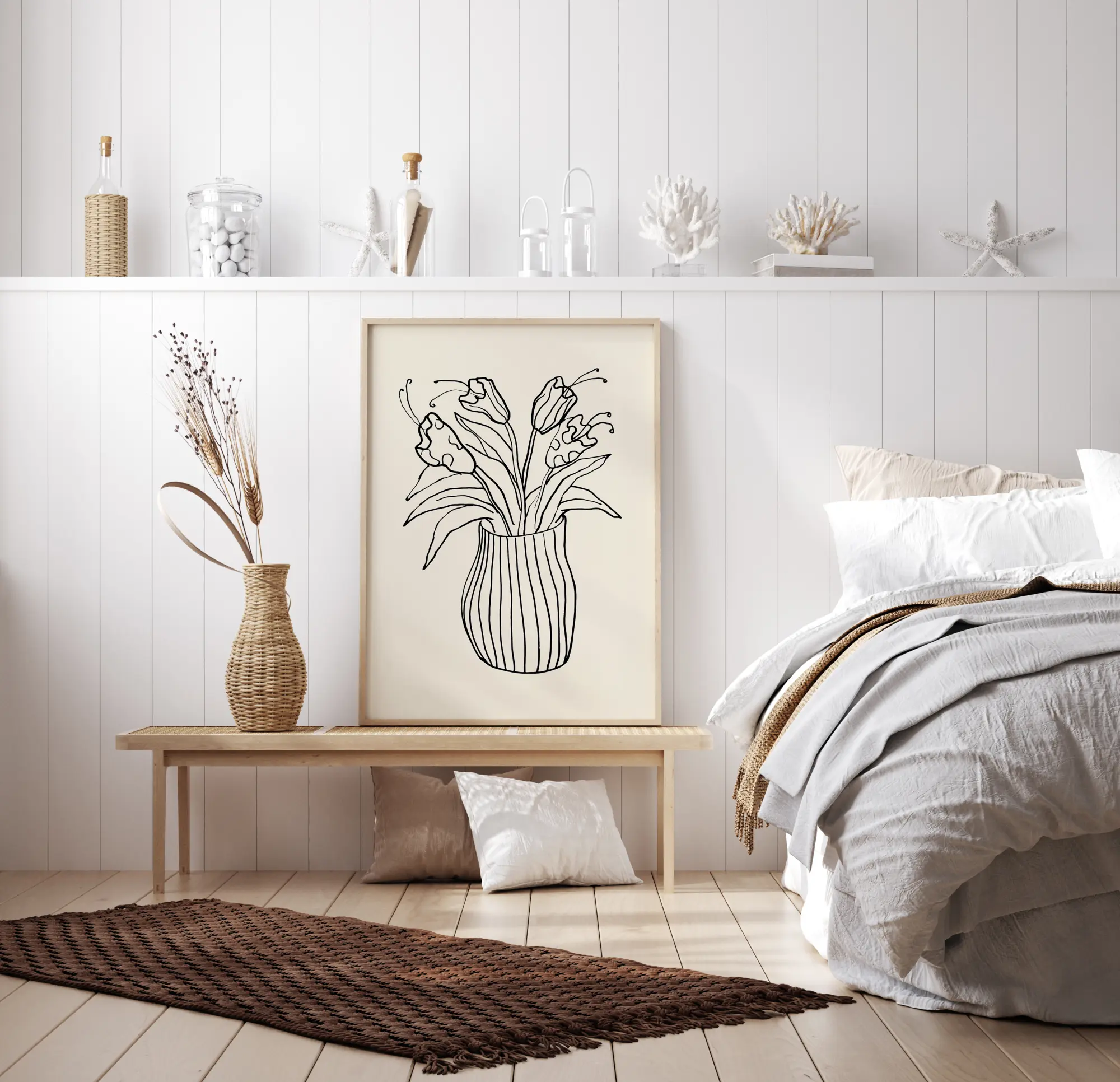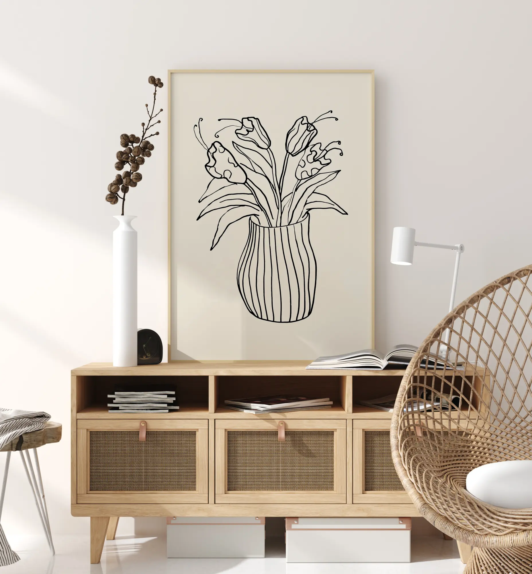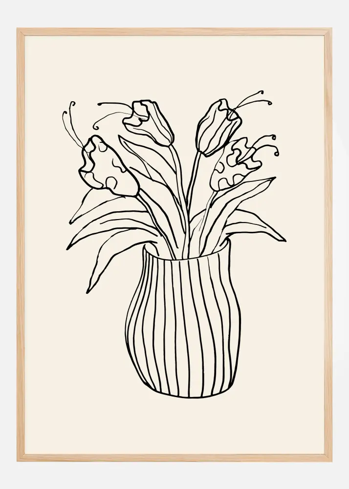 Um póster estilizado com flores em um vaso. As linhas pretas fortes e audaciosas destacam as flores no vaso. Num fundo branco, as flores se destacam claramente. Adicione um pouco mais de cor à imagem pendurando-a numa parede clara e audaciosa.