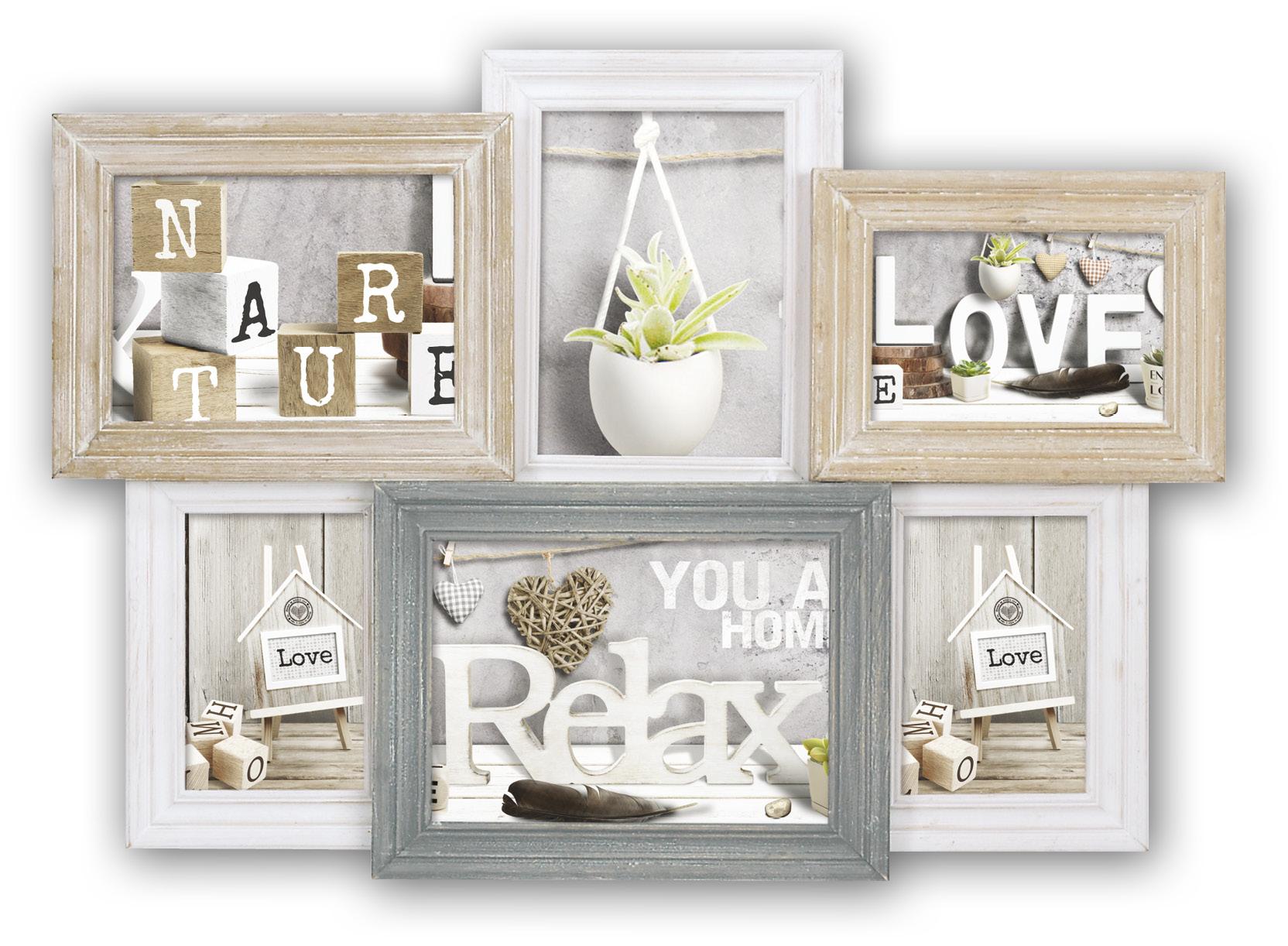 Deixe esta encantadora moldura de colagem adicionar uma sensação natural e relaxante à sua casa! A moldura tem espaço para 6 fotos em diferentes formatos. As molduras são em tons de madeira, cinzento e branco com detalhes gastos.