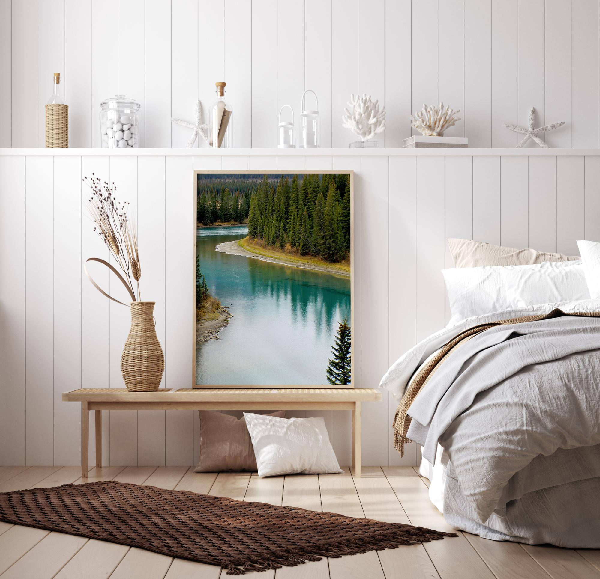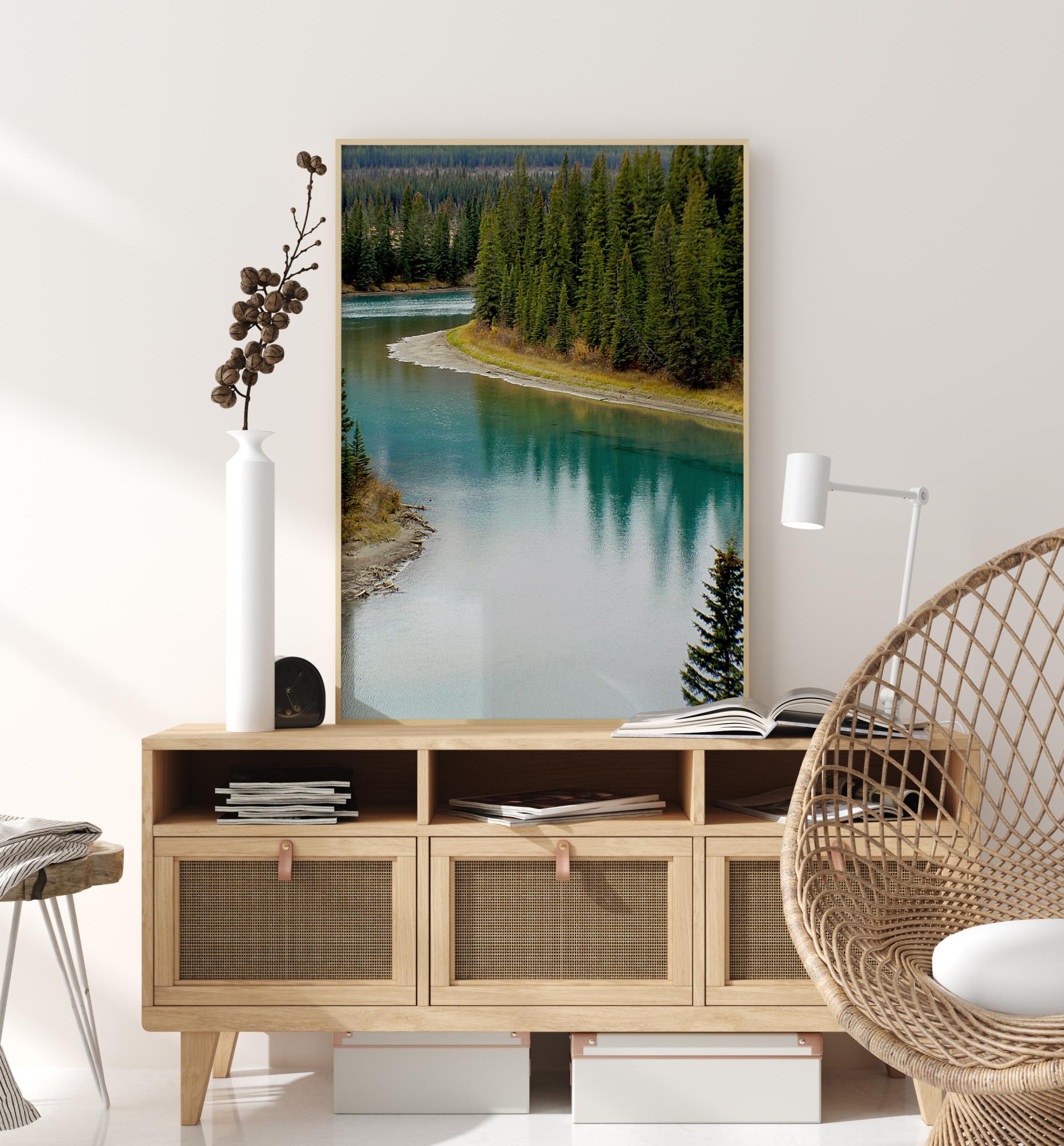 Uma postagem florestal onde pinheiros cercam a margem de um rio largo que serpenteia pelo campo. As árvores verdes ficam altas enquanto a floresta desaparece ao longe. O rio largo é quase colorido como um arco-íris e captura as altas reflexões pontiagudas das árvores em sua superfície.