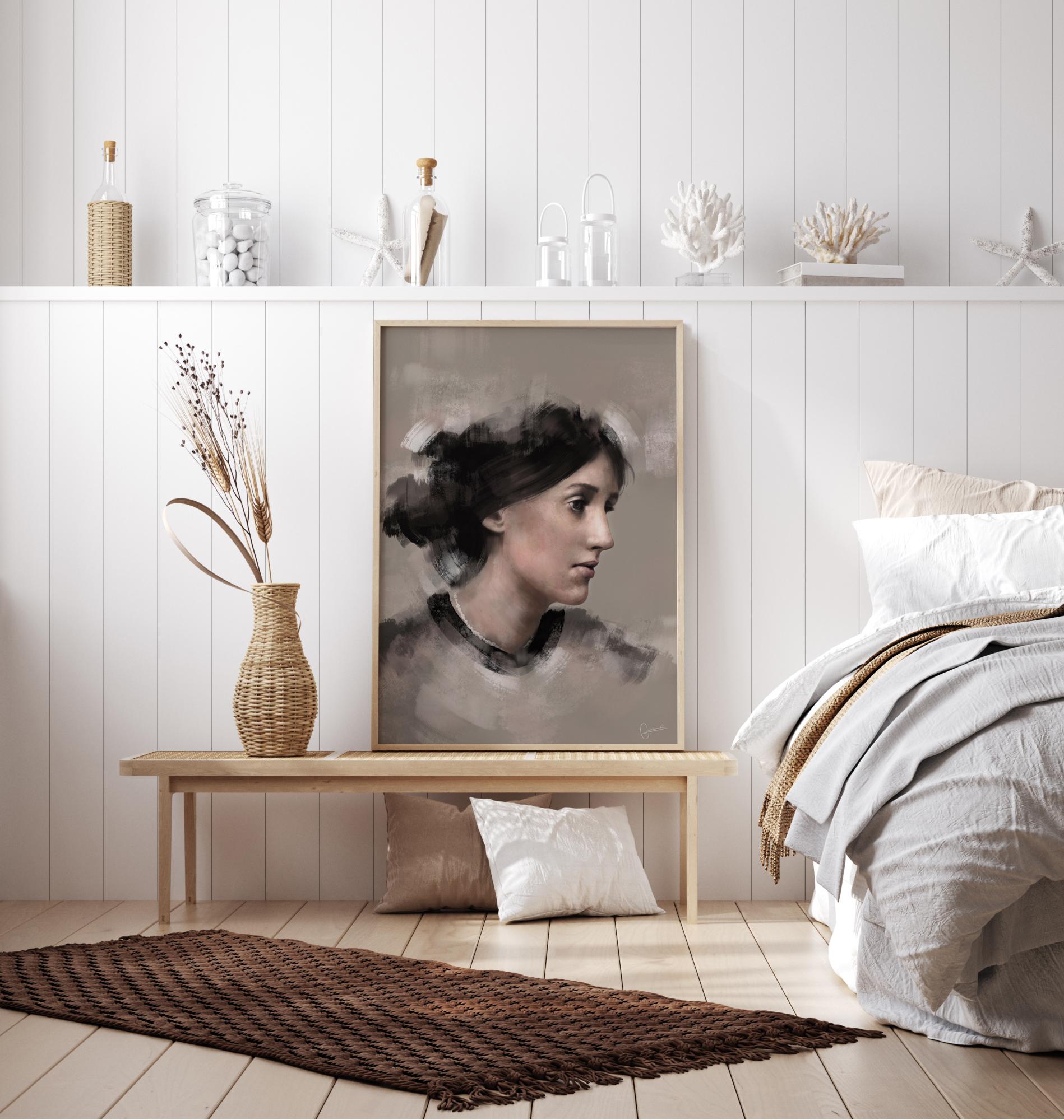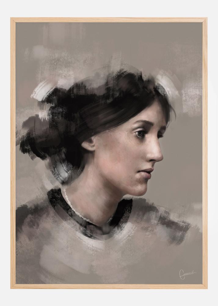 Um póster de retrato de Virginia Woolf em perfil. O seu cabelo é representado por pinceladas simples e suaves, mas seu rosto é retratado com detalhes precisos. O retrato é suave e feminino, conferindo um tom quase melancólico ao seu rosto enquanto ela olha para longe.