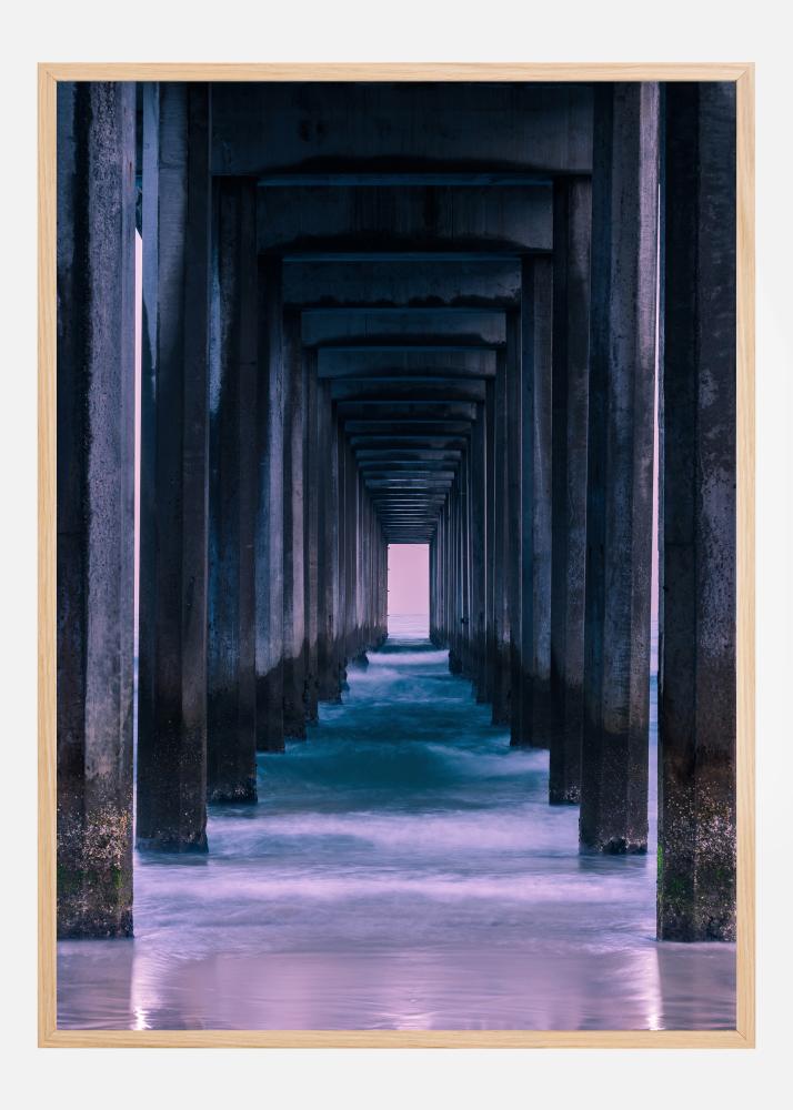 Um póster escuro com um corredor que leva a uma luz no final do túnel. Colunas grossas e escuras de cor azul-marinho cercam uma passagem azul-clara, embora o teto acima também seja bastante escuro e ameaçador. Siga o caminho mais claro para alcançar a luz brilhante ao longe e dar profundidade a um ambiente também.