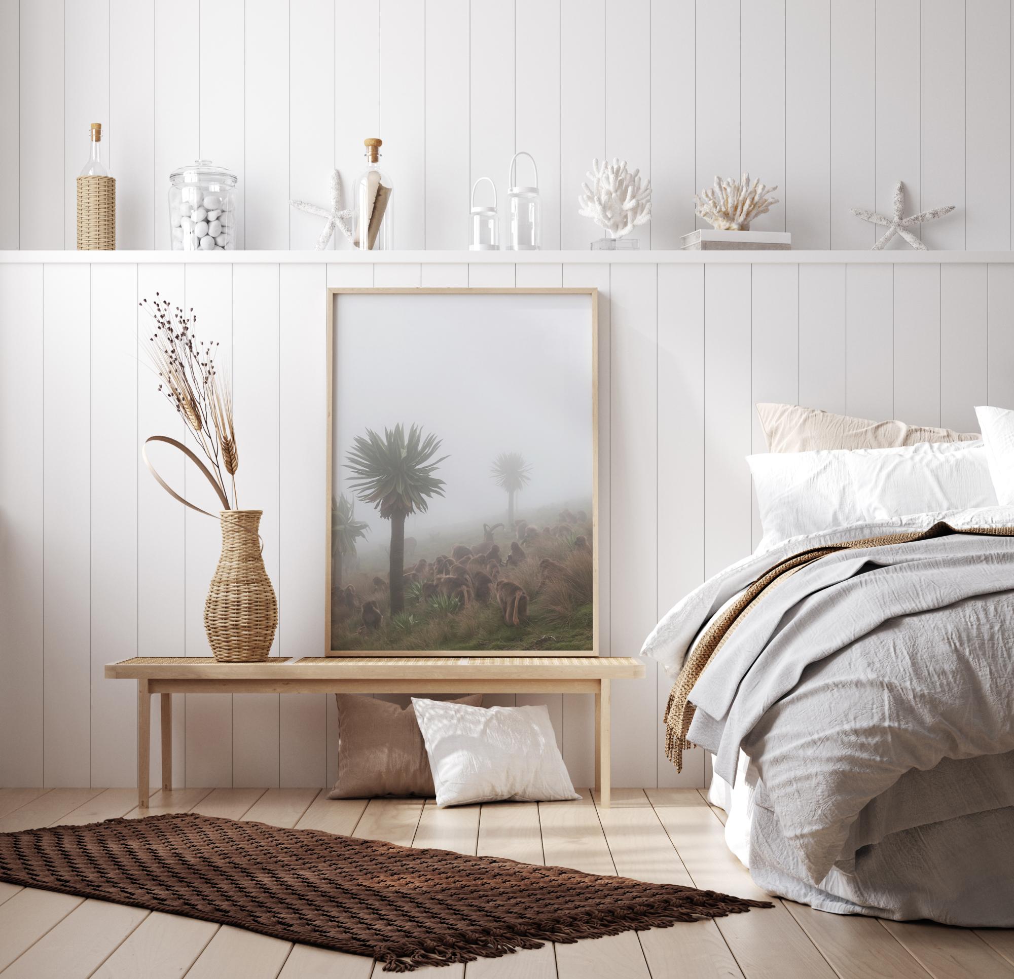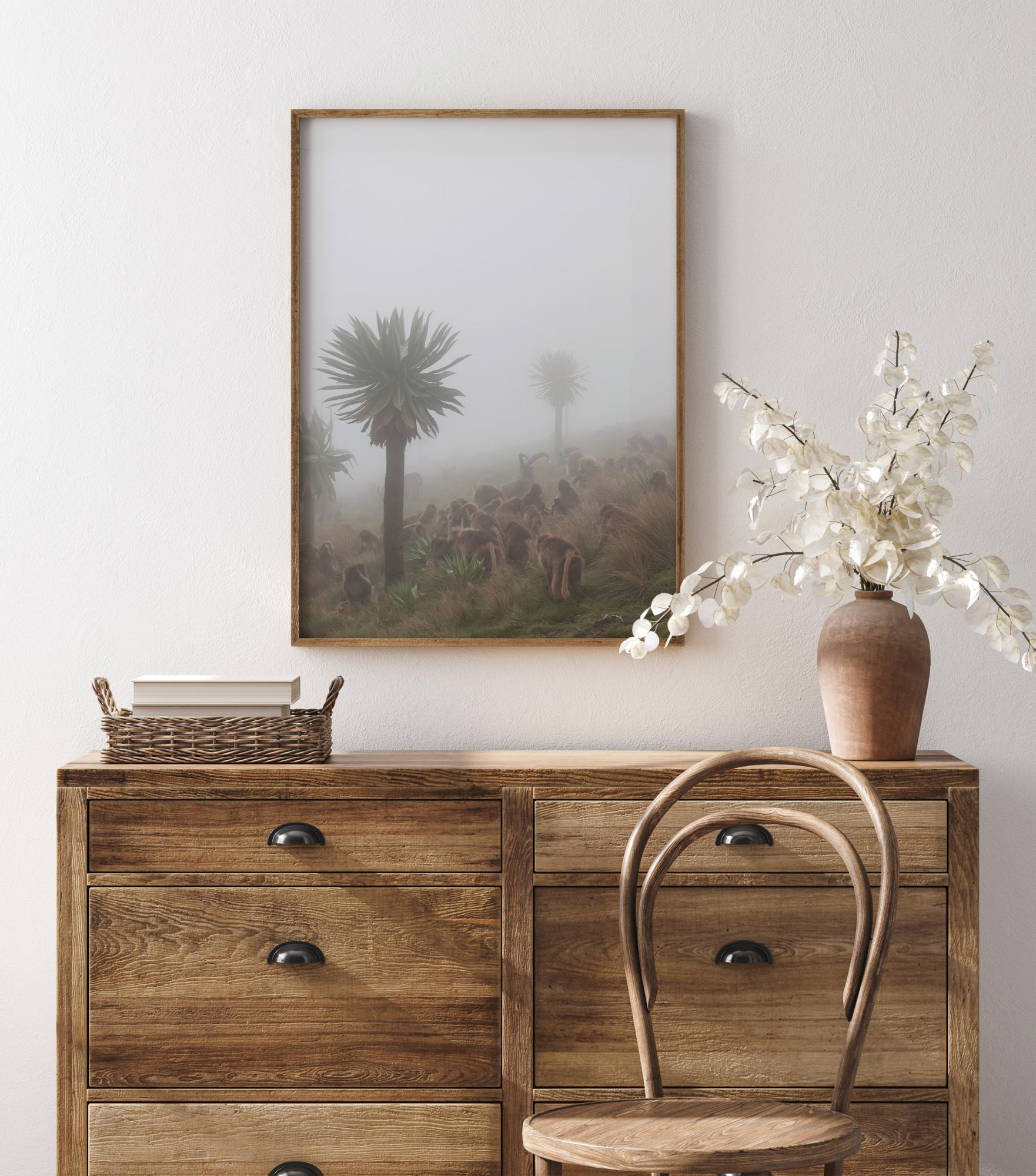 Um póster da vida selvagem com um grupo de babuínos com um impala solitário no meio deles. Este grupo de animais está sentado em uma encosta de montanha nebulosa com várias árvores se estendendo para cima. A cena é calma e pacífica enquanto esses animais tiram um momento para descansar durante o dia.