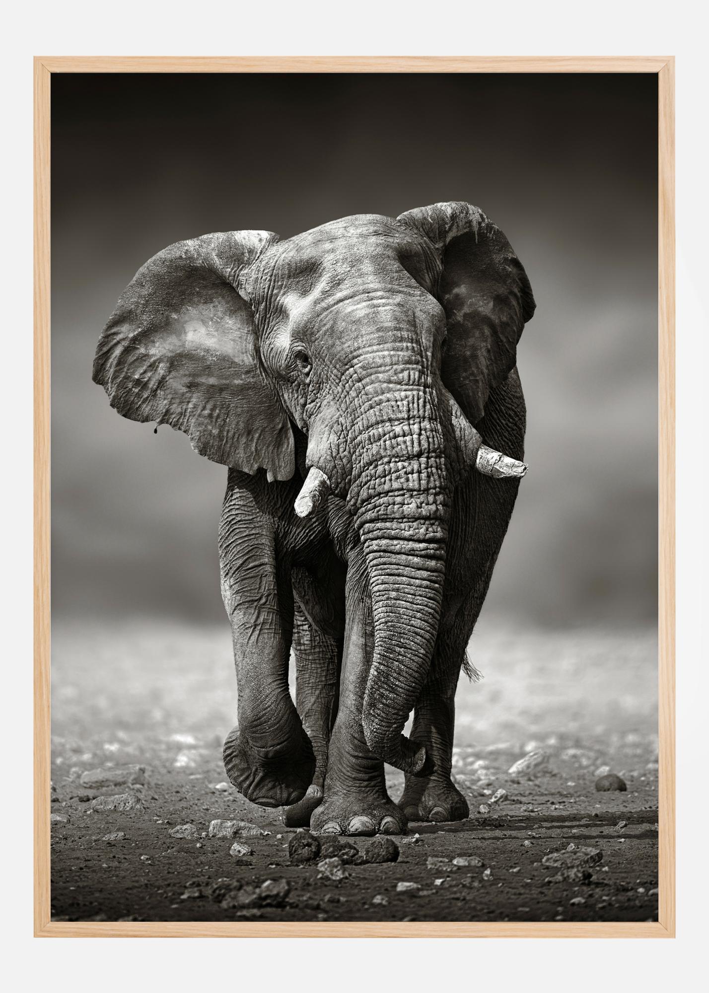 Um magnífico póster com um elefante em preto e branco. O elefante está no meio do seu passo enquanto se move em direção à câmera. Ele parece jovem, com presas curtas e brancas e uma expressão tranquila no rosto. Visite a África enquanto admira esta imagem pendurada em sua casa.