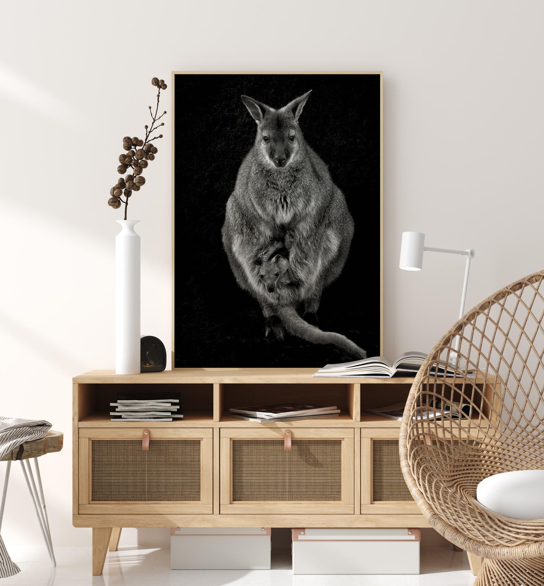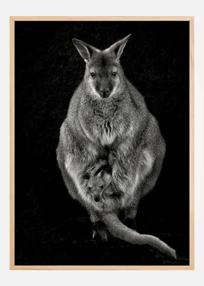 Um póster da natureza com uma wallaby e seu bebé. O casal se destaca em uma imagem incrível num fundo preto. Tenha aquela sensação adorável e suave ao olhar para essa mãe e seu filho.
