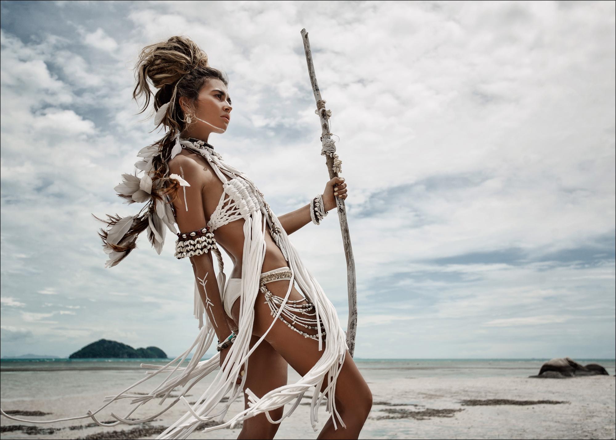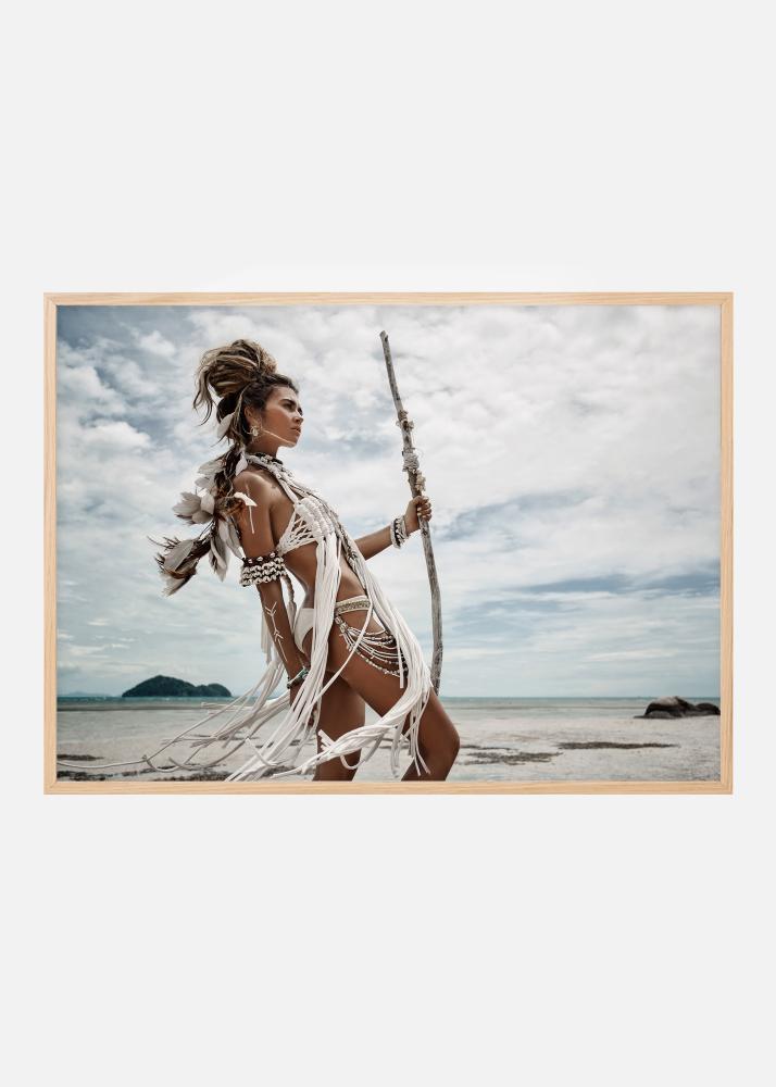Um póster de guerreira com uma jovem mulher posando em uma praia vestida com roupas tribais claras. A sua pele bronzeada contrasta com as roupas brancas e joias que cobrem seu corpo e se entrelaçam em seu cabelo. A sua pose poderosa ganha peso extra com a longa vara que ela segura em sua mão esquerda enquanto encara seus inimigos.