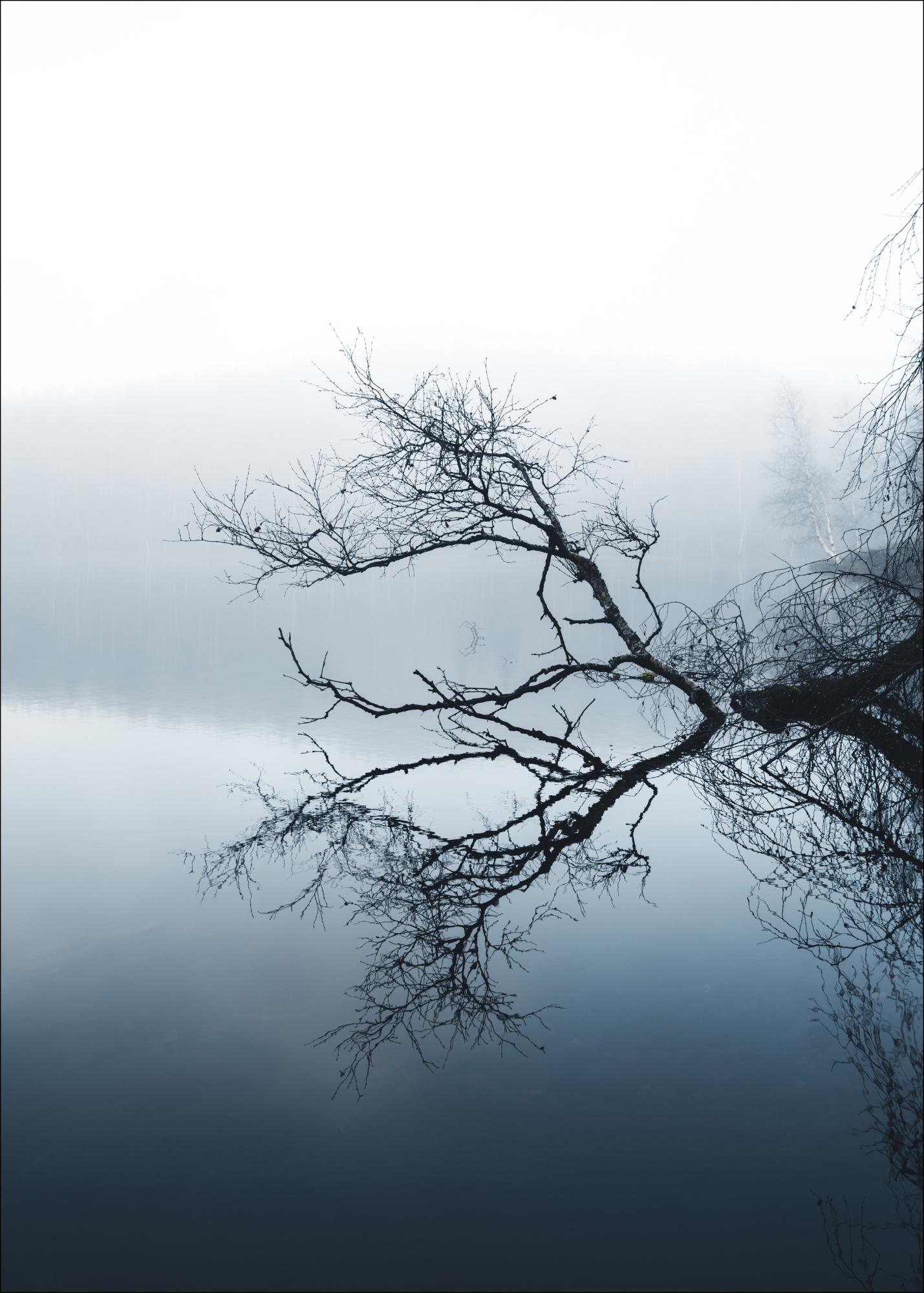 Um póster branco com um amplo lago tranquilo com uma árvore morta emergindo da água. Quando o galho se curva para cima, ele lança seu reflexo no lago, criando uma imagem espelhada fantástica. O céu branco acima ajuda a distinguir entre o galho real e sua imagem espelhada. Os tons de azul proporcionam uma sensação mais fresca a uma parede quente.