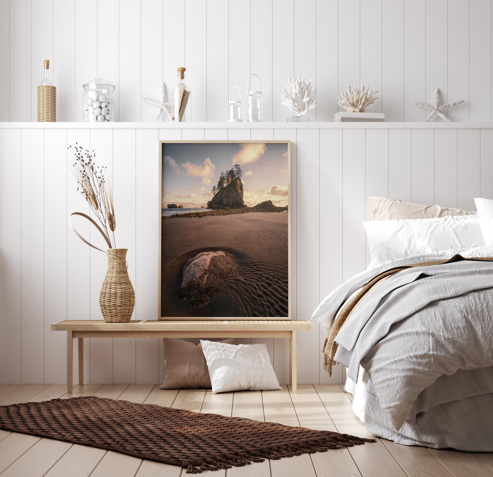 Um cartaz pitoresco com um close-up da praia. O ângulo baixo permite que se aproxime da areia, onde pode seguir as trilhas de água criadas por uma poça d'água. Ao longe, uma rocha coberta de árvores se ergue do mar em direção a um céu azul suave cheio de nuvens brancas adorávels.