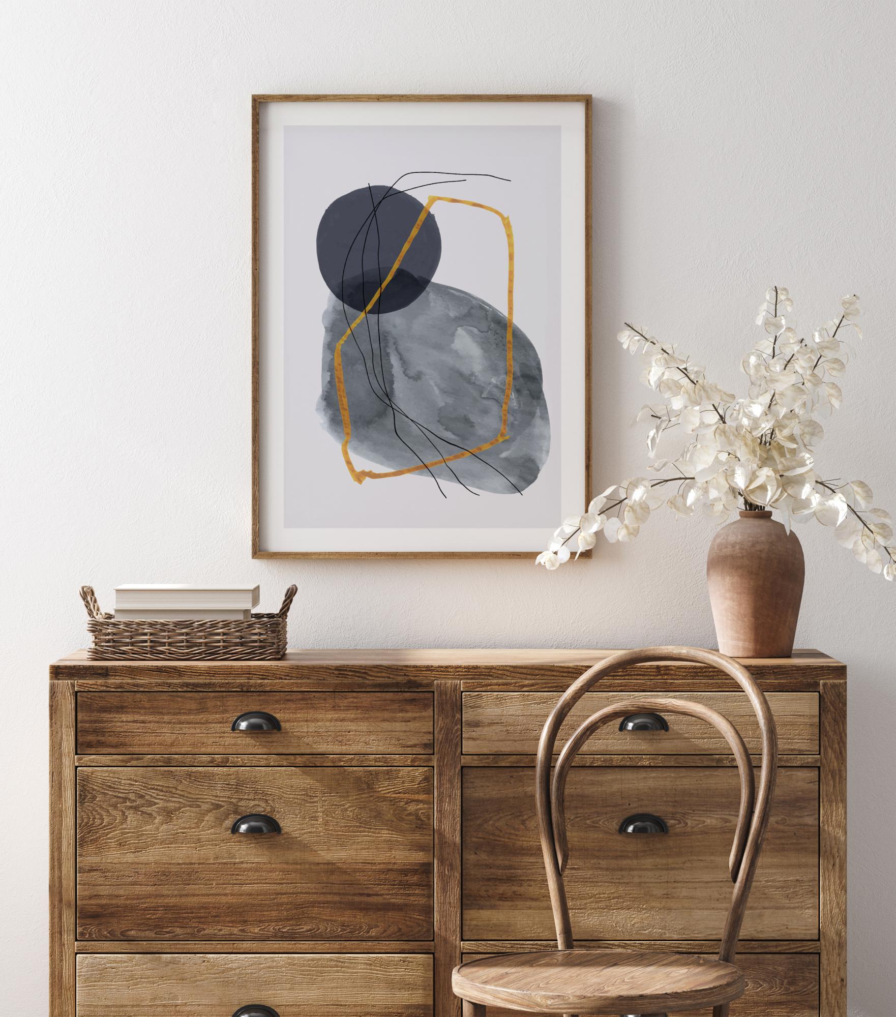 Um póster geométrico com diferentes formas azuis num fundo cinzento. Uma grande forma azul pintada preenche a tela com um círculo cinzento suave acima dela. Linhas pretas se entrelaçam e há uma linha dourada grossa que cria uma terceira forma sobre o topo para uma imagem única e interessante.