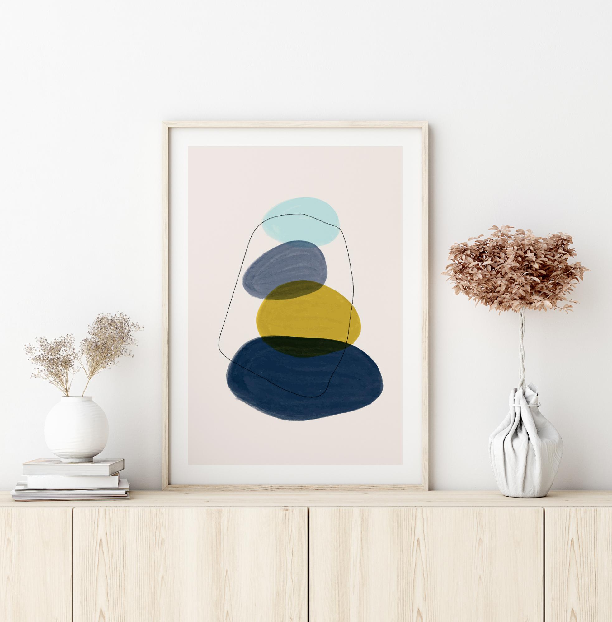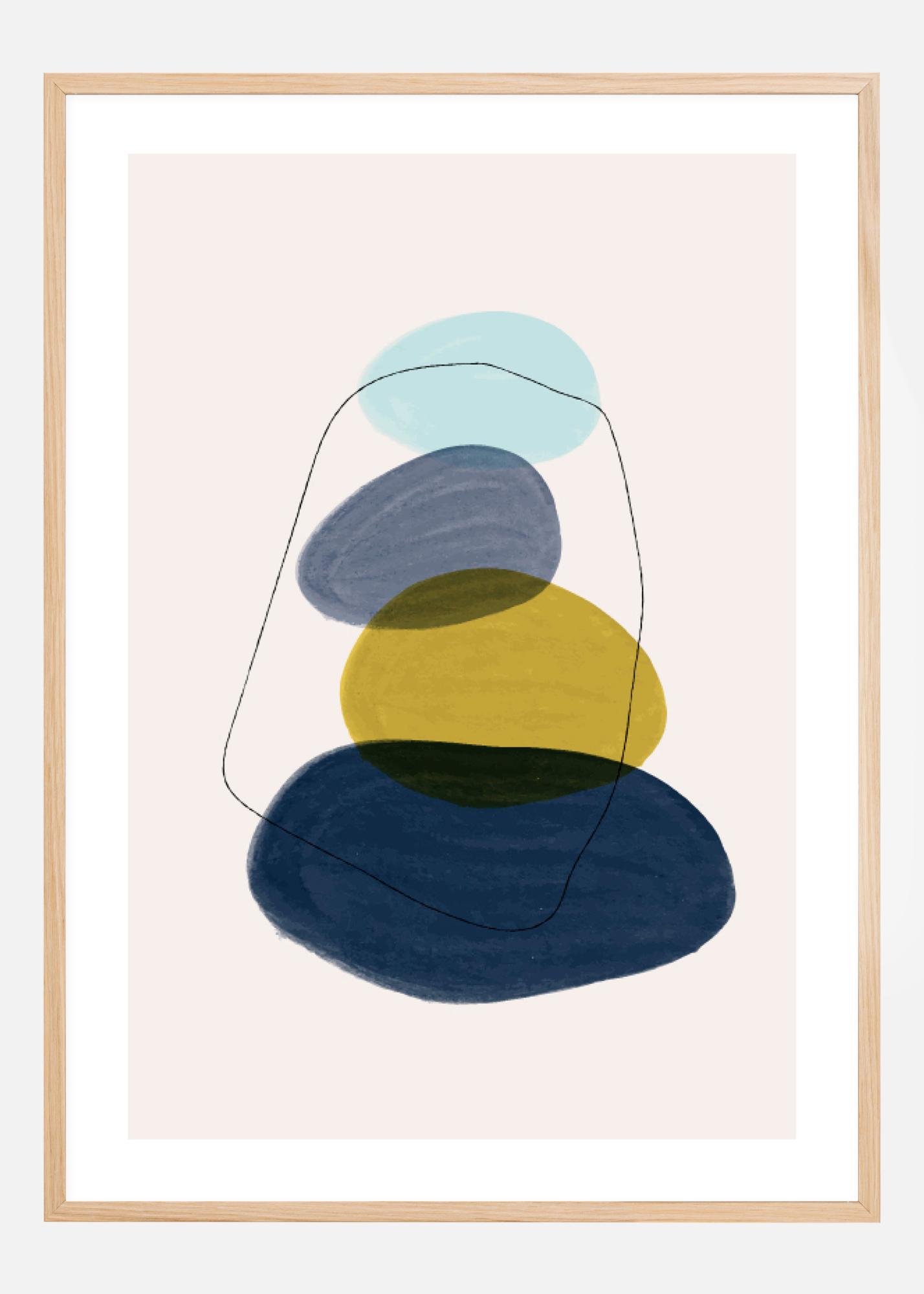 Um póster abstrato divertido com diferentes formas redondas que se parecem com pedras. As formas começam grandes e gradualmente ficam mais pequenas quando empilhadas umas sobre as outras nesta imagem divertida. As cores azul escuro, azul claro e amarelo nesta imagem tornam esta uma obra luminosa e inspiradora para a sua casa.