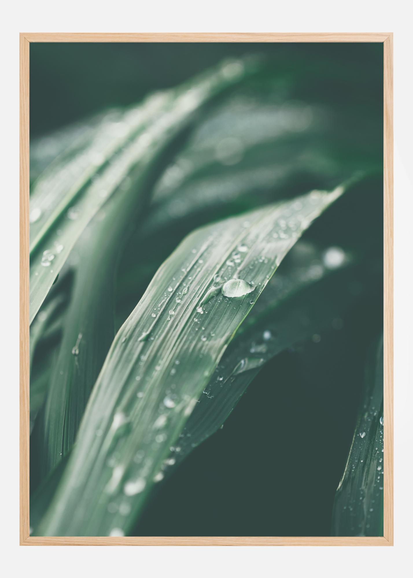 Um póster macro com folhas e gotas de água. As folhas verde-escuras preenchem a imagem com as suas veias em detalhes nítidos. As gotas de água seguem as curvas das folhas e caem em direção às bordas da imagem. Pendure isso numa parede de cor terra macia para uma sensação de floresta.