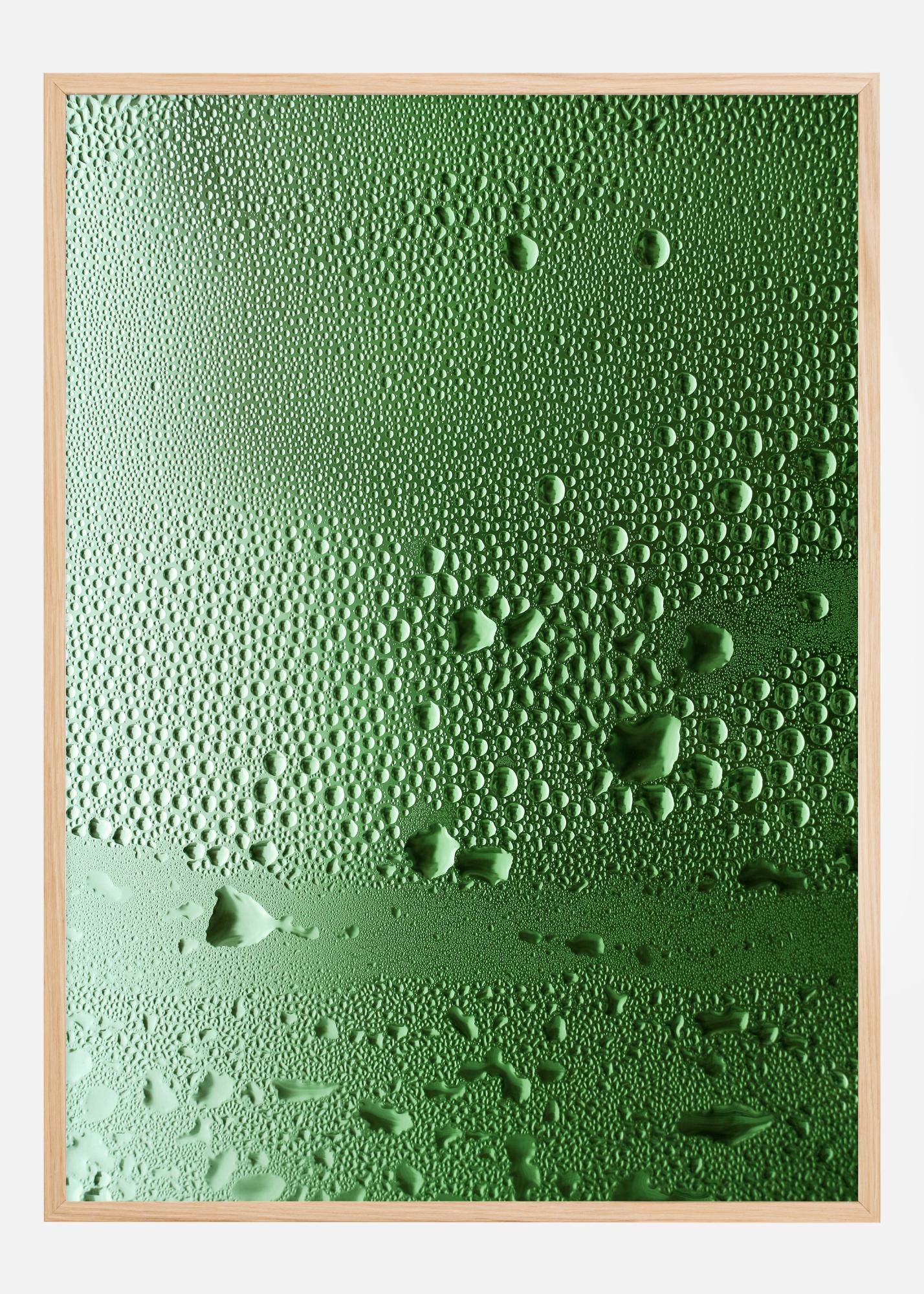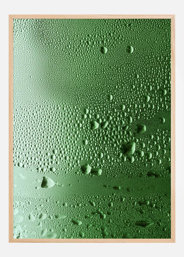 Redescubra a beleza simples dos elementos da natureza com o nosso pôster que destaca a frescura das gotas de água em uma superfície brilhante. Esta obra de arte captura o momento em que as gotas repousam tranquilamente em um fundo verde vibrante, cada uma refletindo a luz e adicionando profundidade e textura à composição simples. Esta impressão é uma lembrança sutil das necessidades puras da vida e da presença calma da natureza.