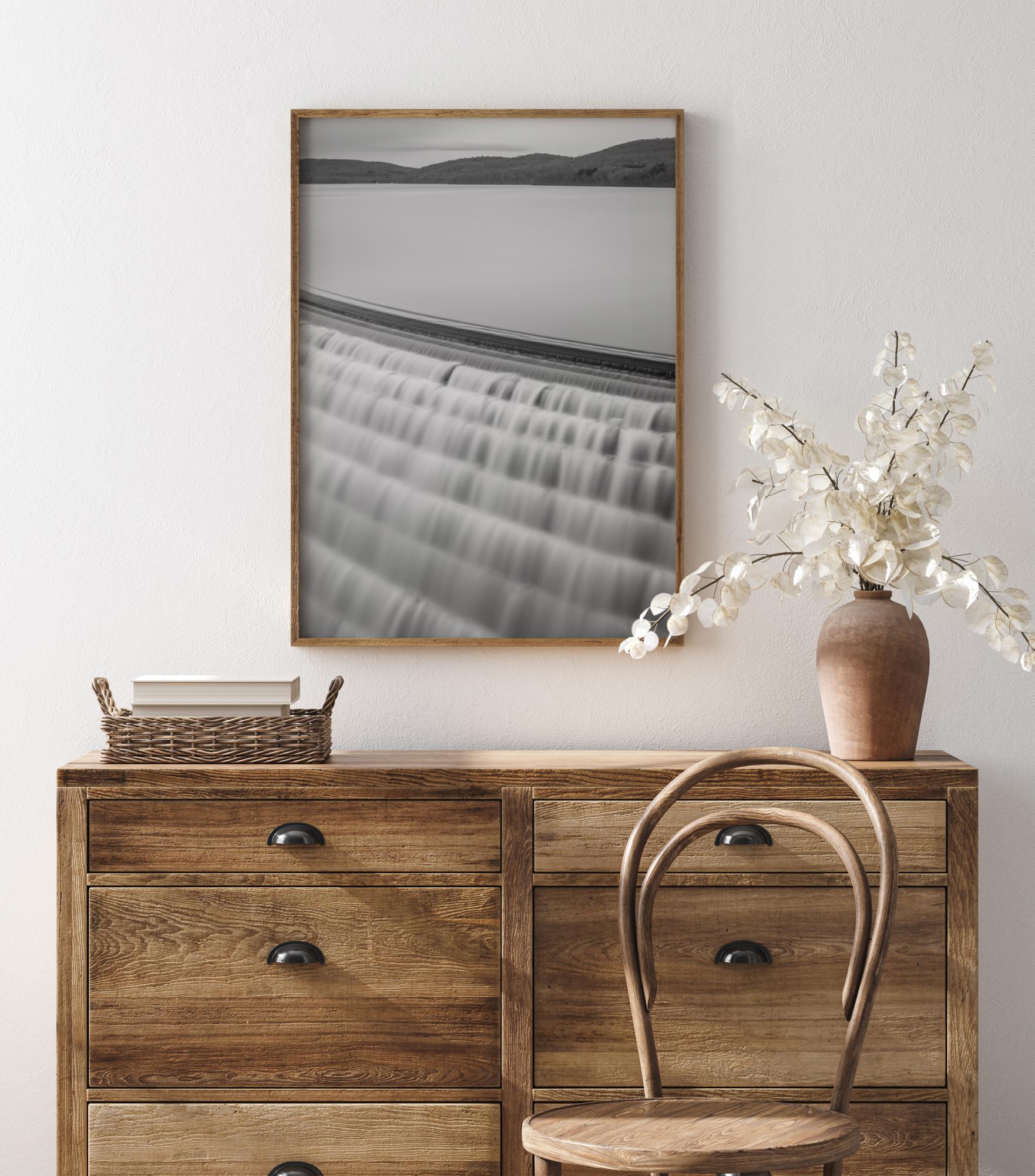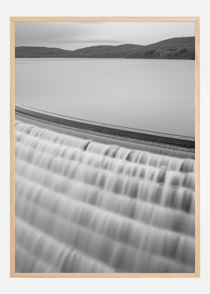 Um póster cinzento com pequenas cachoeiras caindo sobre uma represa sintético em um lago. A água cinzento calma se estende com as pequenas cachoeiras fluindo sobre os pequenos degraus para criar um padrão rápido e em movimento. Relaxe e deixe o olhar seguir o fluxo da água enquanto ela desce.
