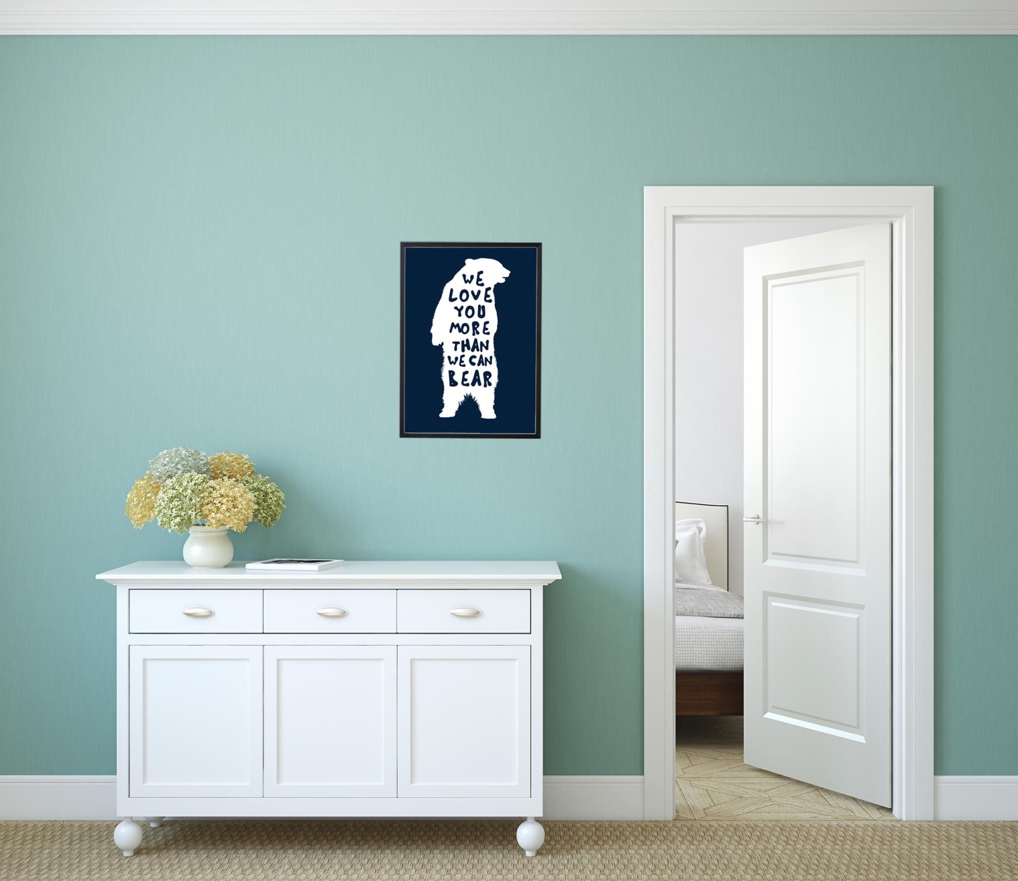 póster criativo e ao mesmo tempo amoroso que combina com aqueles que gostam de ursos um pouco mais. A impressão gráfica é um presente bonito para dar a alguém que se quer mostrar apreço. O póster tem uma silhueta de um urso em branco sobre um fundo escuro e um tipo de letra artística branca para a citação. Emoldure o póster com uma moldura elegante e sofisticada que combine com a decoração geral para criar uma sensação de harmonia no ambiente.