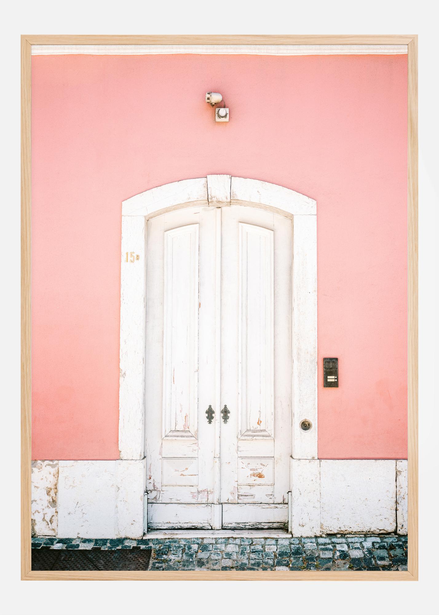 Este pôster apresenta uma bela imagem de uma porta branca contra uma parede rosa suave, uma visão que exala o estilo relaxado e ainda assim elegante que é tão típico de Lisboa. A superfície pintada de branco da porta, que mostra sinais de pátina e idade, oferece uma sensação de história e caráter, enquanto os detalhes em ferro preto dão um toque clássico. O número da casa "15" está discretamente colocado à esquerda da porta, e a calçada pavimentada reforça o charme da paisagem urbana europeia.