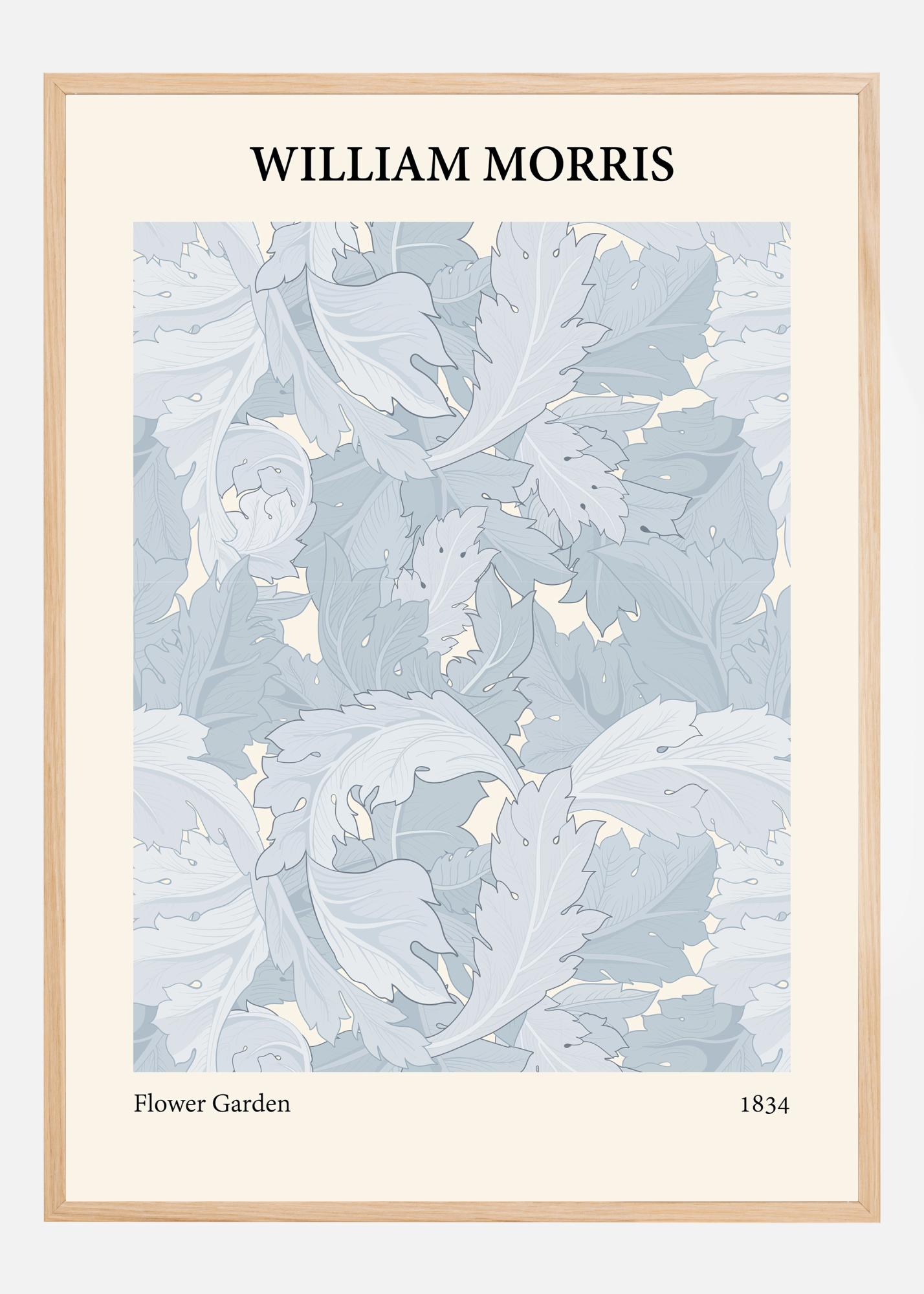 Com uma atmosfera de tranquilidade e elegância, este pôster de William Morris apresenta uma sinfonia de folhagens intrincadas em uma paleta de cores fria e relaxante. "Flower Garden", como o título sugere, captura a essência de um jardim exuberante e silencioso através de seu padrão de folhas detalhado que flui sobre a superfície com um ritmo suave. A paleta de cores é cuidadosamente escolhida para refletir a beleza sutil da natureza e inclui azul celeste, verde folha e cremes pálidos, que juntos criam uma estética harmoniosa e equilibrada.
