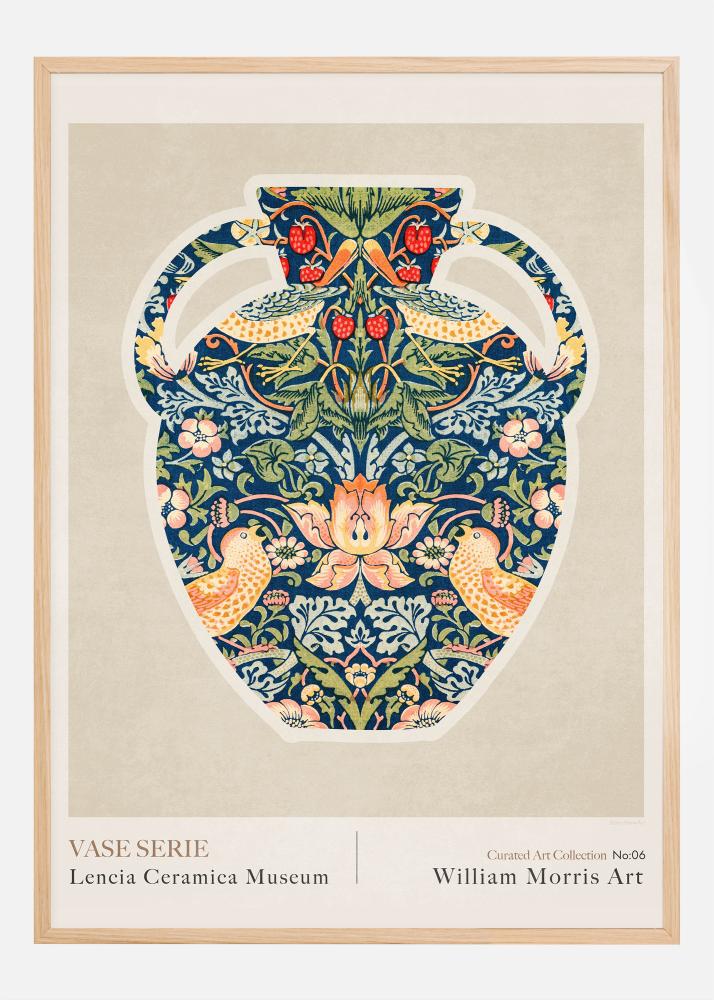 Pôster número 06 em nossa "Coleção de Arte Curada" no Museu Lencia Ceramica é uma homenagem abundante ao artesanato de William Morris. Ele retrata um vaso adornado com um padrão simétrico e detalhado, animado com motivos de pássaros e flores que são icônicos para a filosofia de design de Morris. Cada elemento deste padrão é cuidadosamente elaborado para celebrar a beleza da natureza e a capacidade da arte de imitá-la.