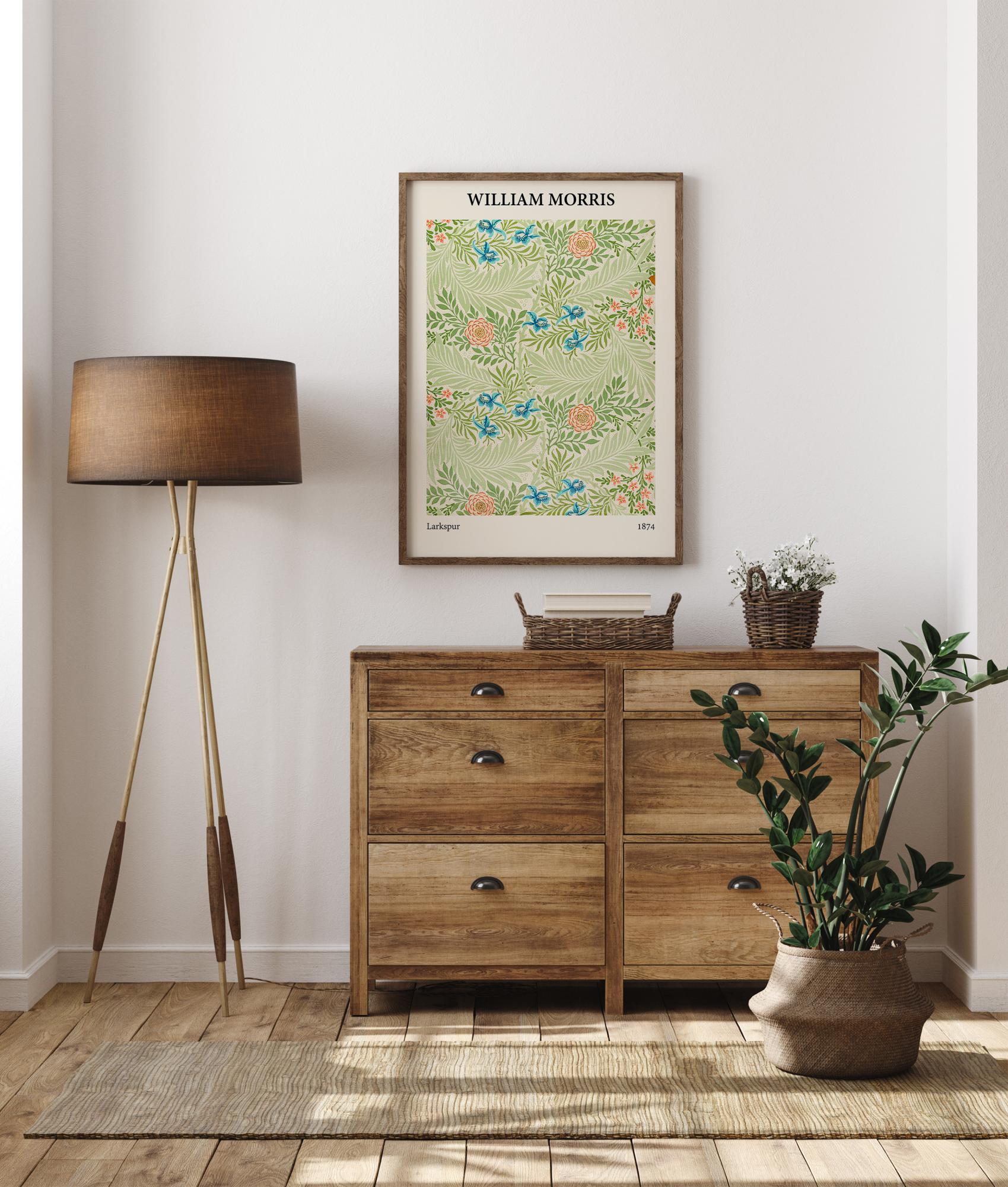 Um póster clássico com uma impressão de William Morris de delphiniums. As cores pastel suaves de pêssego, azul e verde tornam esta uma impressão divertida para pendurar na parede. Aproveite o padrão repetitivo e sinta-se acalmado pelas cores suaves que esta impressão contém.