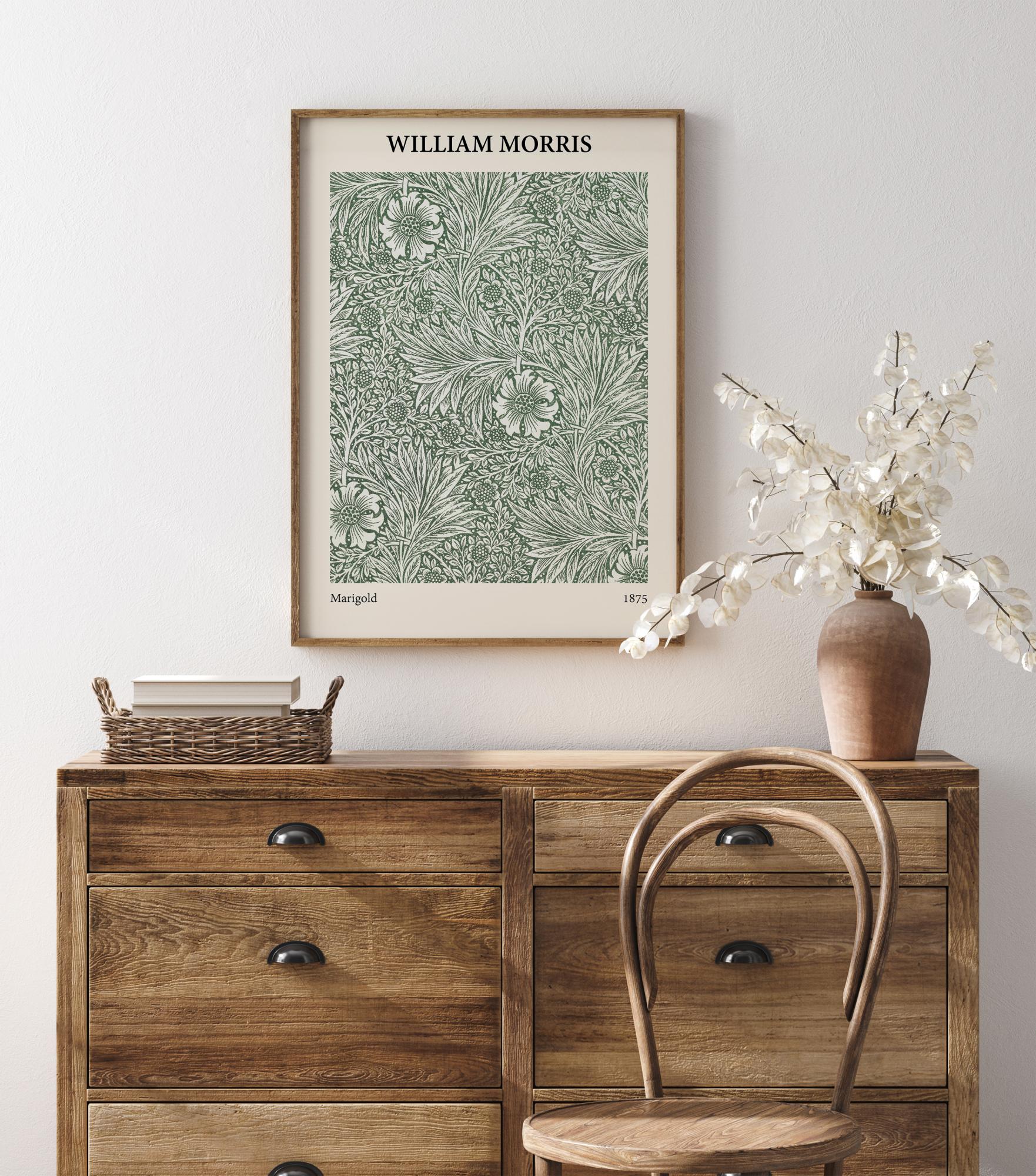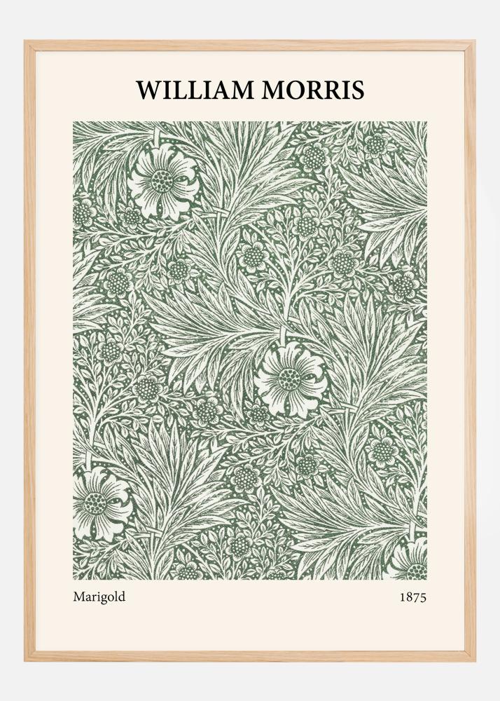 Um póster clássico com uma impressão de calêndula de William Morris. Este padrão divertido é composto por linhas pretas e brancas, onde as folhas e as flores giram por toda a imagem em um padrão meio repetido. Pendure esta impressão em uma sala de jardim para obter a sensação completa de botânica.