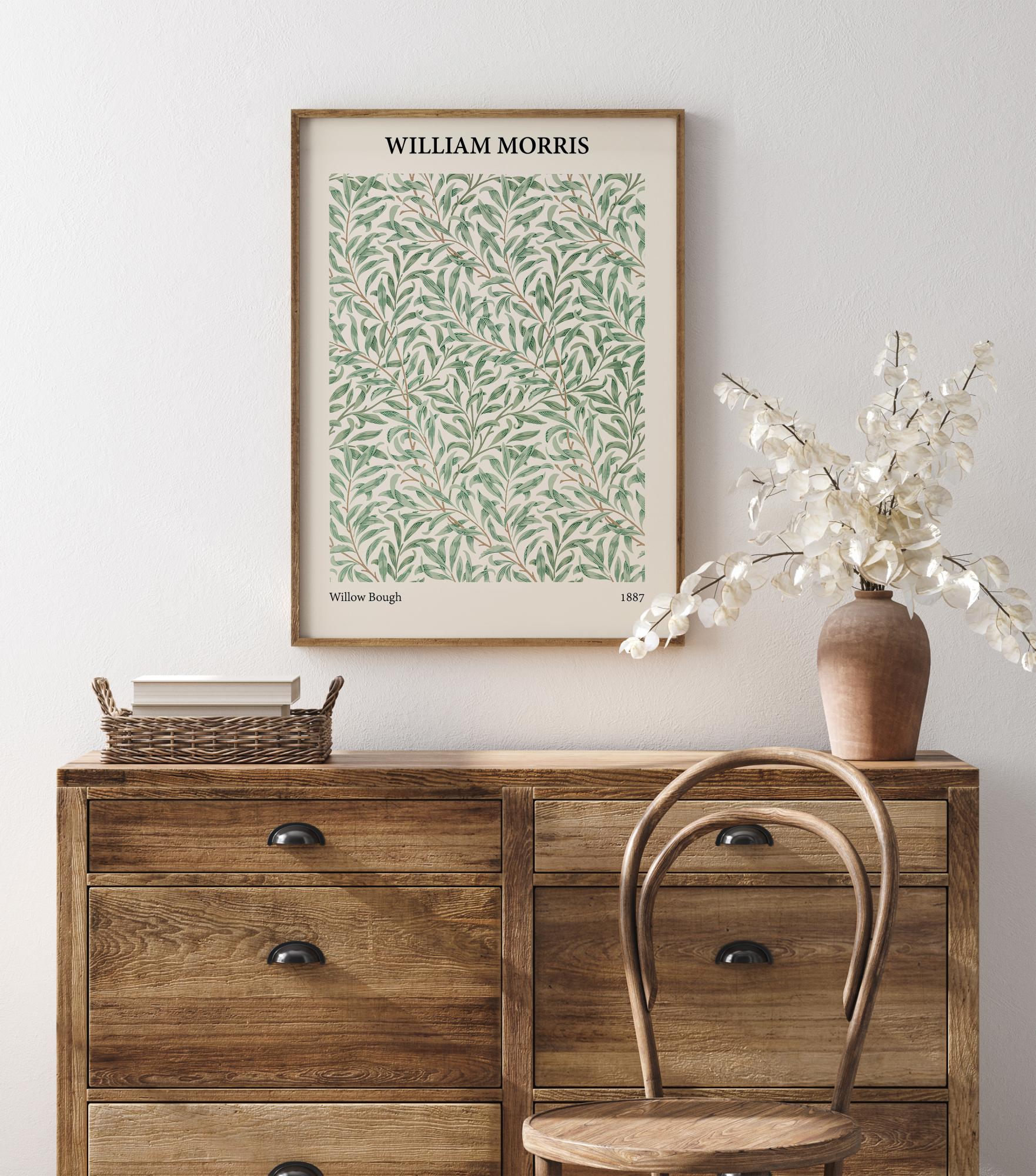Um póster impressãodo com o padrão de flechas de William Morris. As simples folhas verdes preenchem a imagem impressa, cada uma ligada por galhos finos para criar um padrão intricado em toda a imagem. Pendure este numa parede de cor pastel para obter algo um pouco diferente.