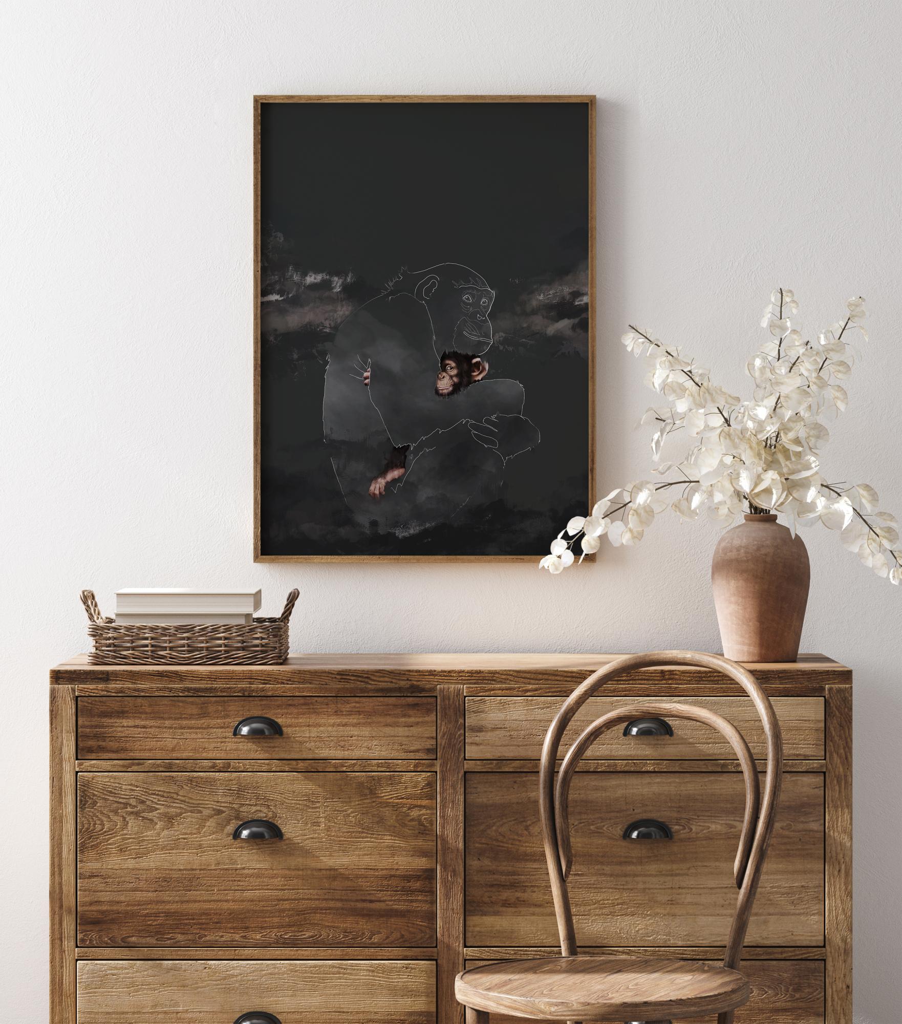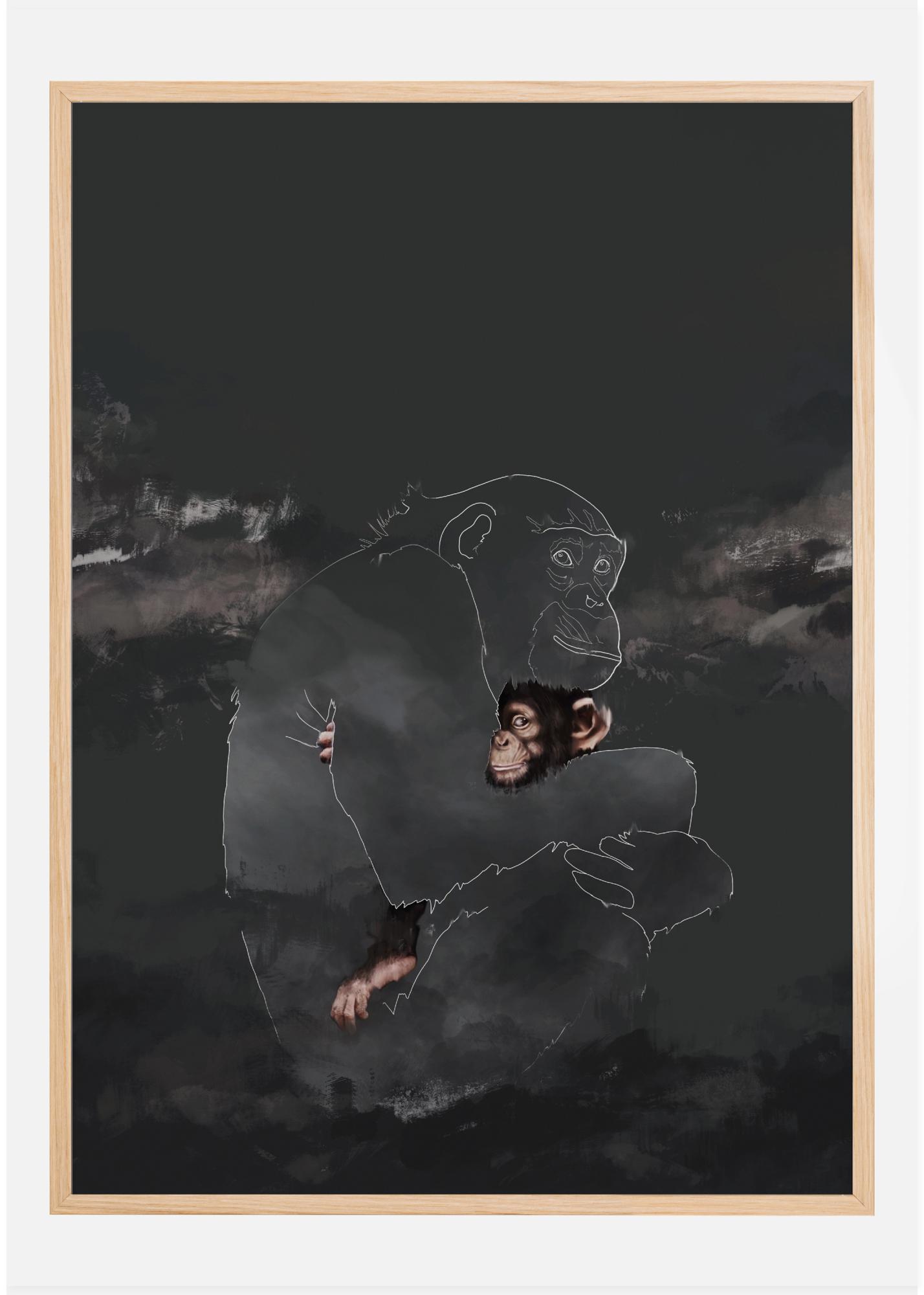 Um póster emocionante com um bebé chimpanzé abraçando a imagem perdida da sua mãe. Esta é uma imagem comovente quando o filhote de chimpanzé abraça nada além dos contornos da sua mãe, que está sentada em nuvens macias no céu negro.