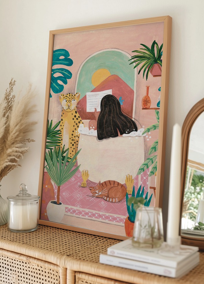 Woman taking bath in pink tropical bathroom Póster (21x29.7 cm (A4))