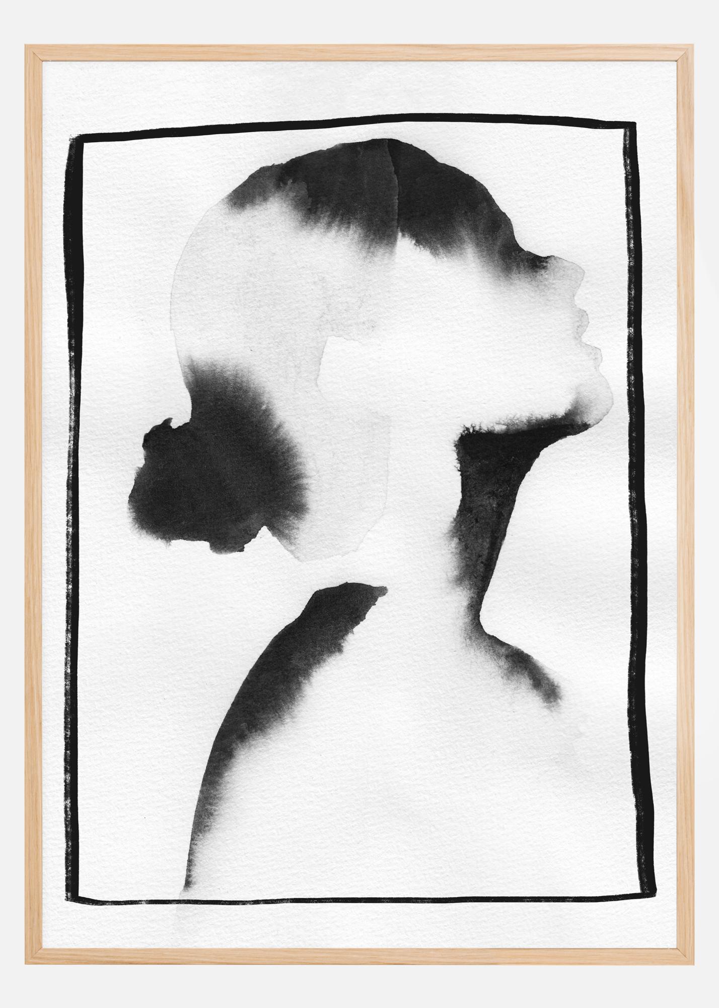 Um póster de aquarela suave com o perfil de uma mulher. Usando a técnica suave de aquarela, o cabelo e o rosto da mulher são criados deixando a cor se espalhar com a água. Isso cria uma imagem cativante em preto e branco que ficará ótima num fundo claro.