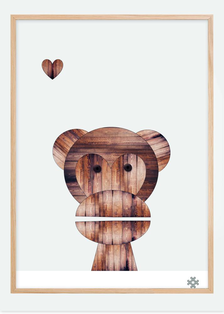 Um póster com tábuas de madeira onde a madeira cria a forma de um pequeno macaco. Acima do macaco há um pequeno coração. O macaco olha para na imagem e lhe dá todo o amor. Este pequeno macaco amoroso é astuto e peculiar e é a opção perfeita para decorar o quarto de uma criança.