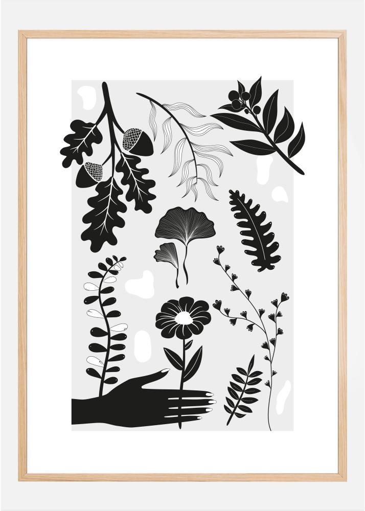 Um póster audacioso com figuras em preto e branco de várias folhas, plantas e flores. Uma mão preta se estende para pegar uma das flores estilizadas. Bolotas, flores, samambaias e muito mais preenchem esta impressão simples, mas interessante. Coloque-se em um clima botânico ao pendurar este póster de planta em sua casa.