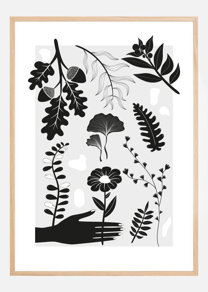 Um póster audacioso com figuras em preto e branco de várias folhas, plantas e flores. Uma mão preta se estende para pegar uma das flores estilizadas. Bolotas, flores, samambaias e muito mais preenchem esta impressão simples, mas interessante. Coloque-se em um clima botânico ao pendurar este póster de planta em sua casa.