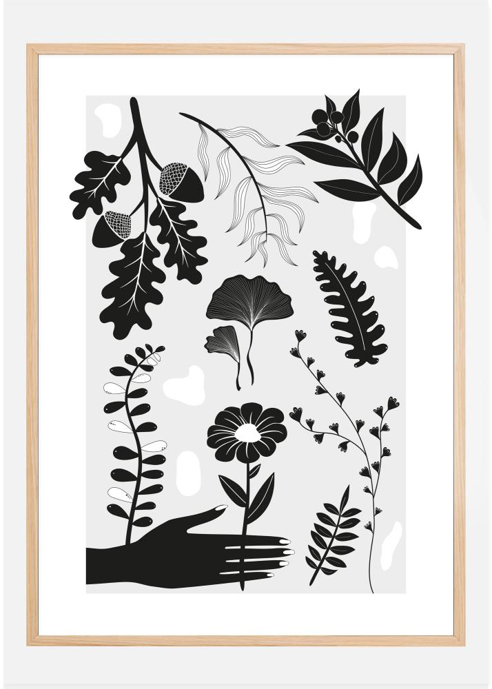 Um póster audacioso com figuras em preto e branco de várias folhas, plantas e flores. Uma mão preta se estende para pegar uma das flores estilizadas. Bolotas, flores, samambaias e muito mais preenchem esta impressão simples, mas interessante. Coloque-se em um clima botânico ao pendurar este póster de planta em sua casa.