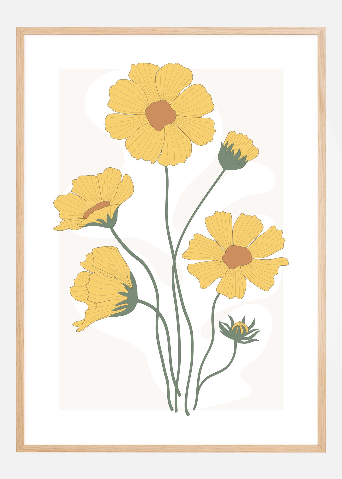 Um póster claro com calêndulas amarelas criadas em um estilo de impressão divertido. Cada uma das flores brilha contra o fundo branco. Apesar de ser um design estilizado simples, as flores são alegres e a maneira perfeita de acordar com um sorriso nos lábios.