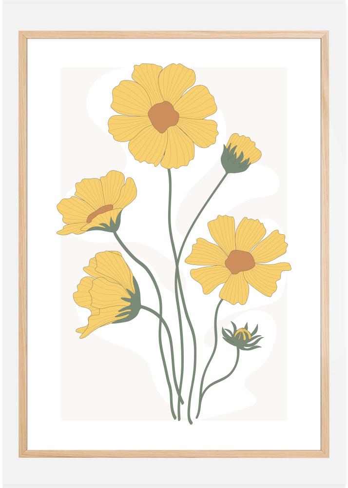 Um póster claro com calêndulas amarelas criadas em um estilo de impressão divertido. Cada uma das flores brilha contra o fundo branco. Apesar de ser um design estilizado simples, as flores são alegres e a maneira perfeita de acordar com um sorriso nos lábios.