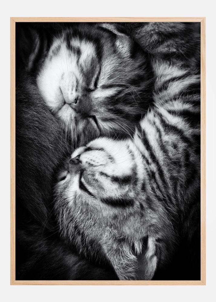 Um póster adorável de animais com dois filhotes de gato dormindo. Compre esta impressão e desfrute da sensação de um abraço enquanto você observa esses gatinhos adorávels se abraçando.