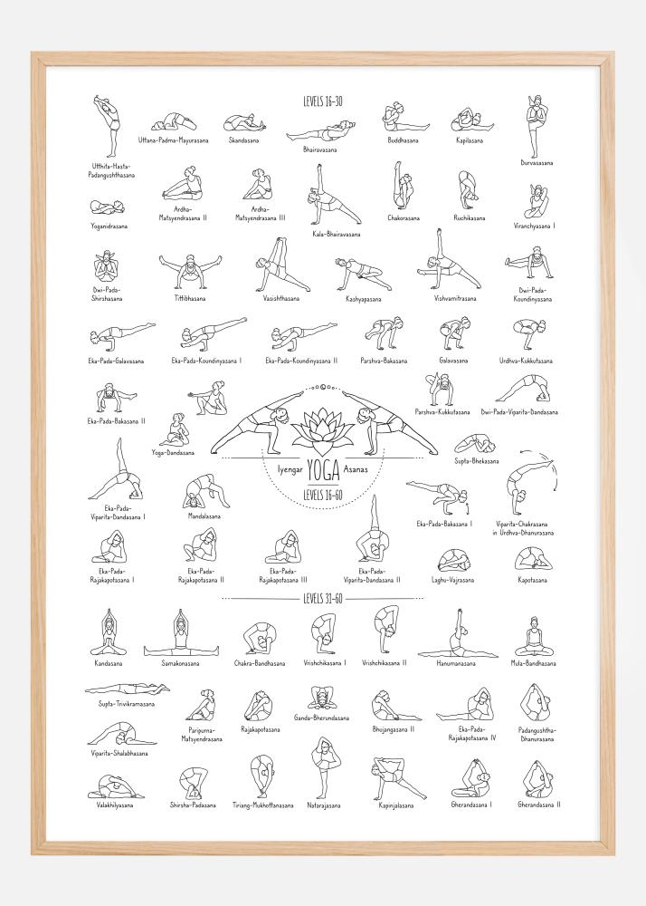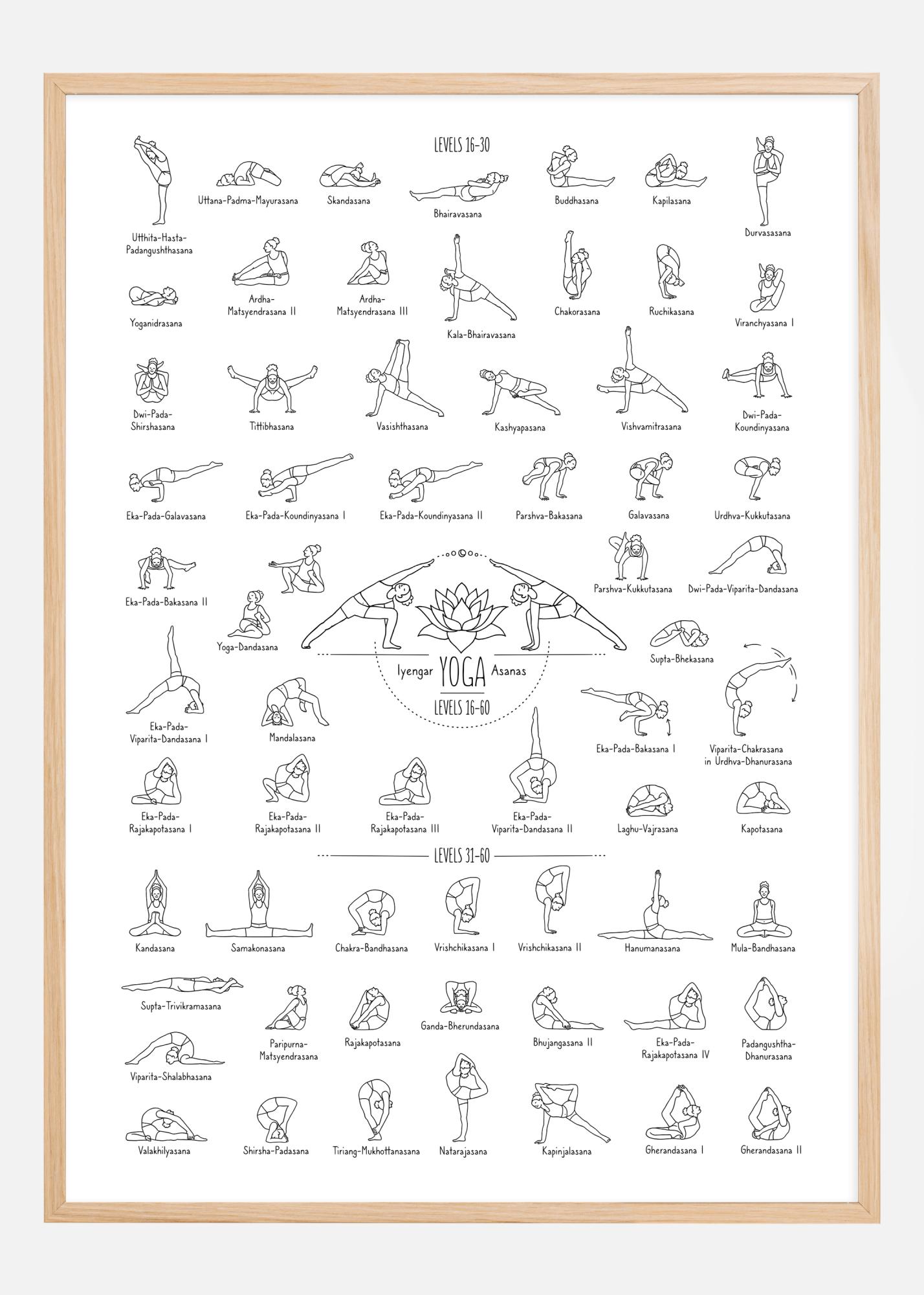 Centralizado e em destaque no cartaz está o título 'Iyengar YOGA Asanas' e os níveis de dificuldade, indicando que esses exercícios se originam da forma específica de ioga desenvolvida por B.K.S. Iyengar. Este pôster educativo é perfeito para um entusiasta de ioga que deseja aprofundar sua prática, bem como para instrutores que precisam de uma referência visual em seus estúdios. Seu design limpo e simples o torna uma decoração elegante e funcional, ao mesmo tempo que contribui com uma atmosfera inspiradora e educativa na sala.