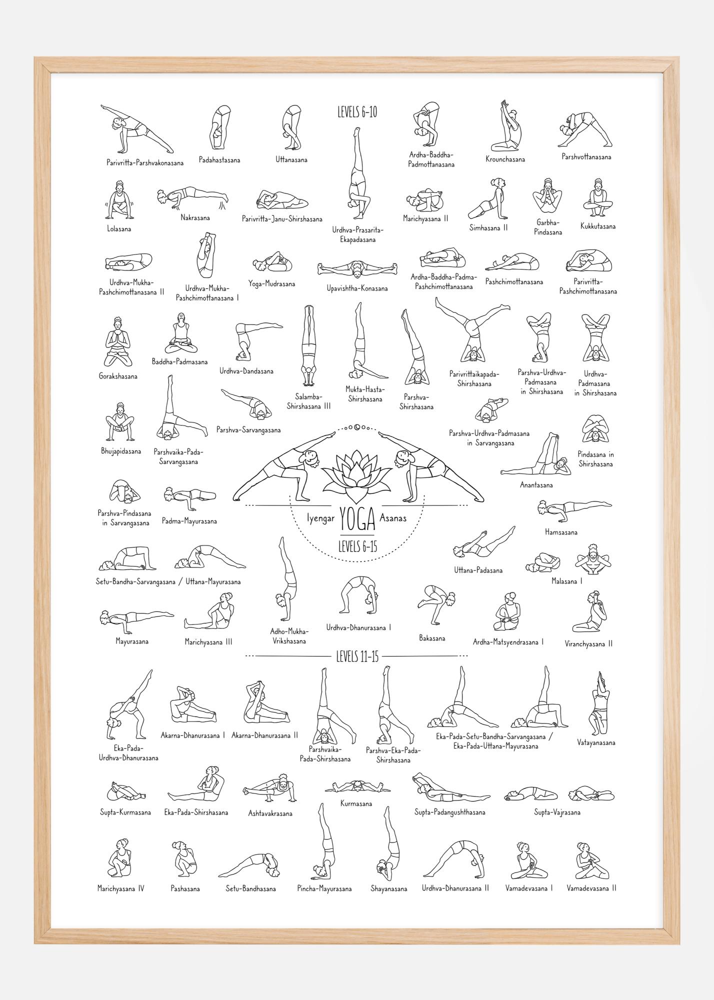 Este cartaz abrangente e instrutivo oferece um guia visual para Iyengar Yoga Asanas dos níveis 6 a 15, apresentado em um layout claro e metódico. As ilustrações detalhadas são renderizadas com linhas precisas que destacam as formas e posturas únicas de cada pose de yoga. Acima de cada imagem está o nome da asana em sânscrito, o que facilita para praticantes de todos os níveis identificar e praticar cada posição.