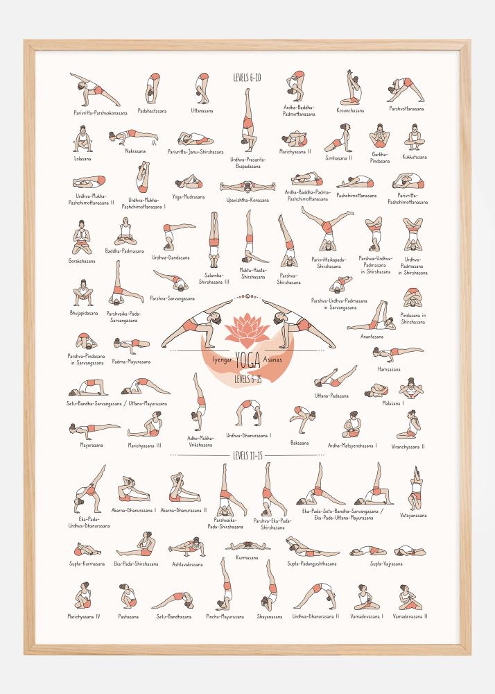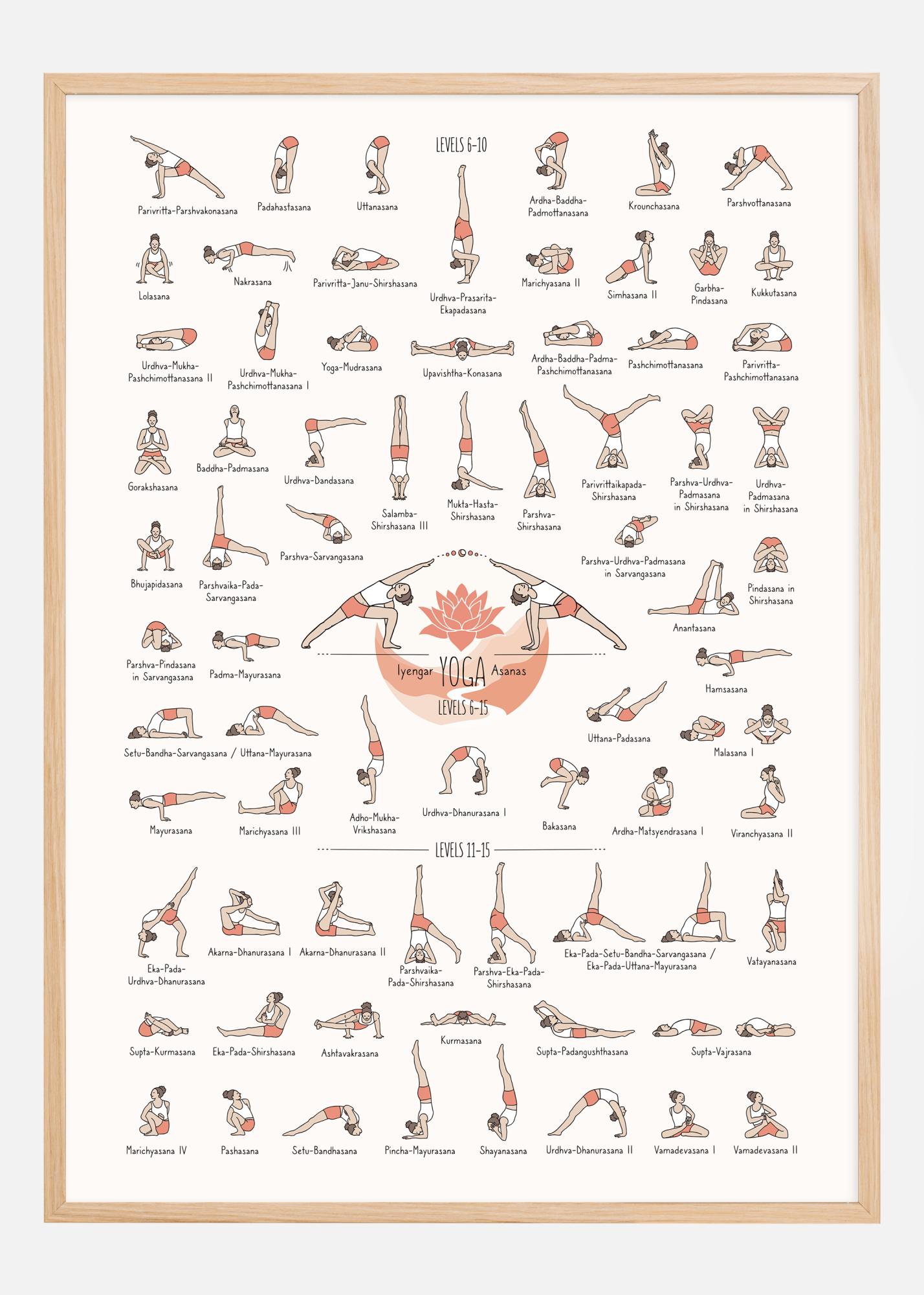 Este pôster de ioga detalhado e colorido ilustra uma coleção abrangente de asanas do Iyengar Yoga do nível 6 ao 15. Cada posição de ioga é finamente ilustrada com cores quentes e agradáveis que destacam cada forma e gesto, ao mesmo tempo em que os nomes claramente identificáveis ao lado de cada ilustração facilitam o acompanhamento e a prática. O design é tanto funcional quanto estético, criando uma atmosfera acolhedora para praticantes de ioga de todos os níveis de conhecimento.